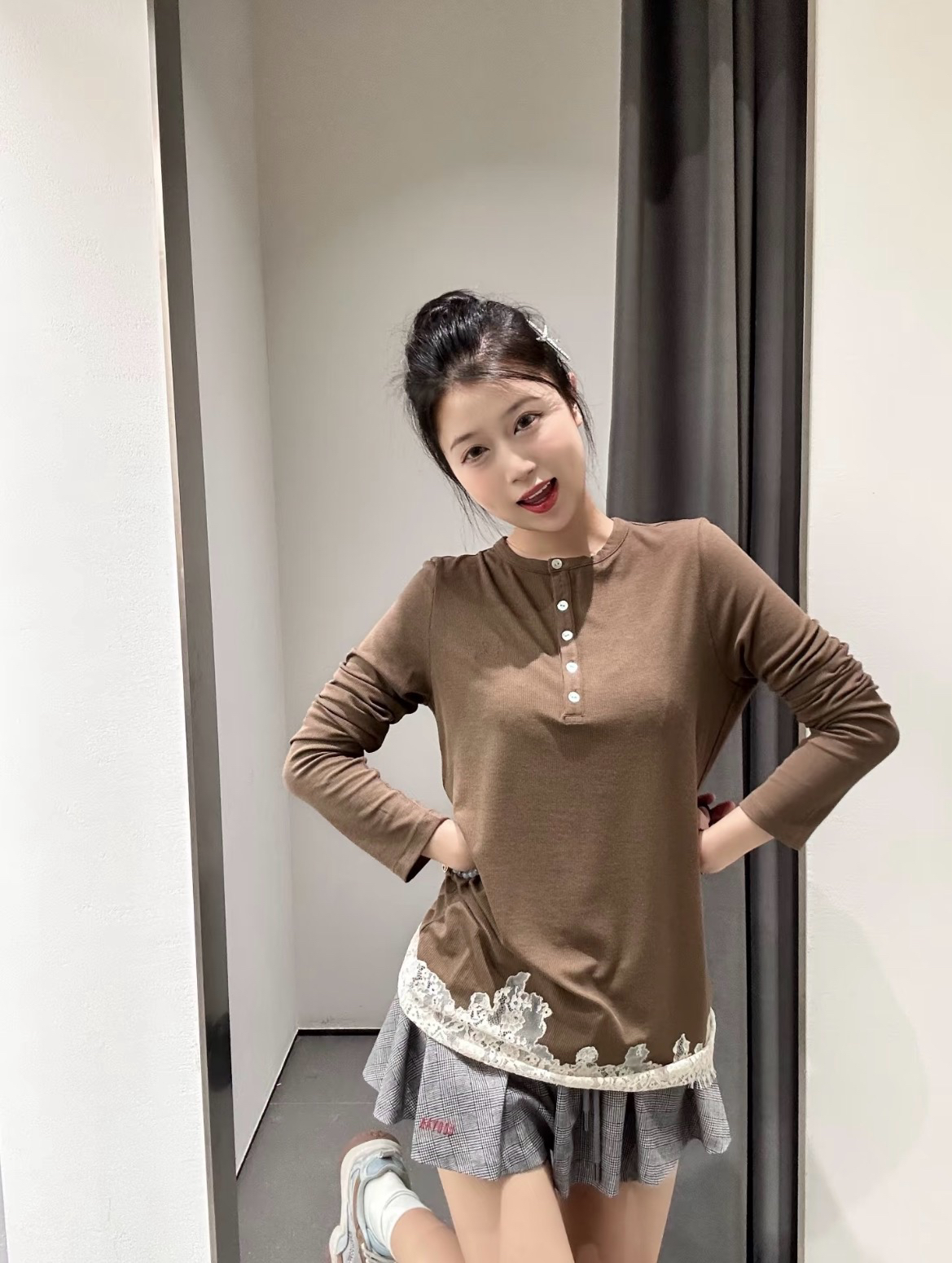 【开放日忙 秒杀价已调 直接拍】乌丫25年 秋季新款 蕾丝拼接亨利领 法式复古精致刺绣字母修身打底衫 长袖衫