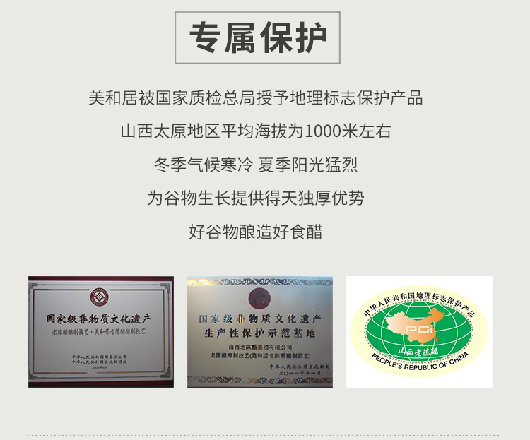 - 美和居始创于1368年,为山西老陈醋开创者,国家级非物质文化遗产酿制技艺,国家地理标志保护产品!