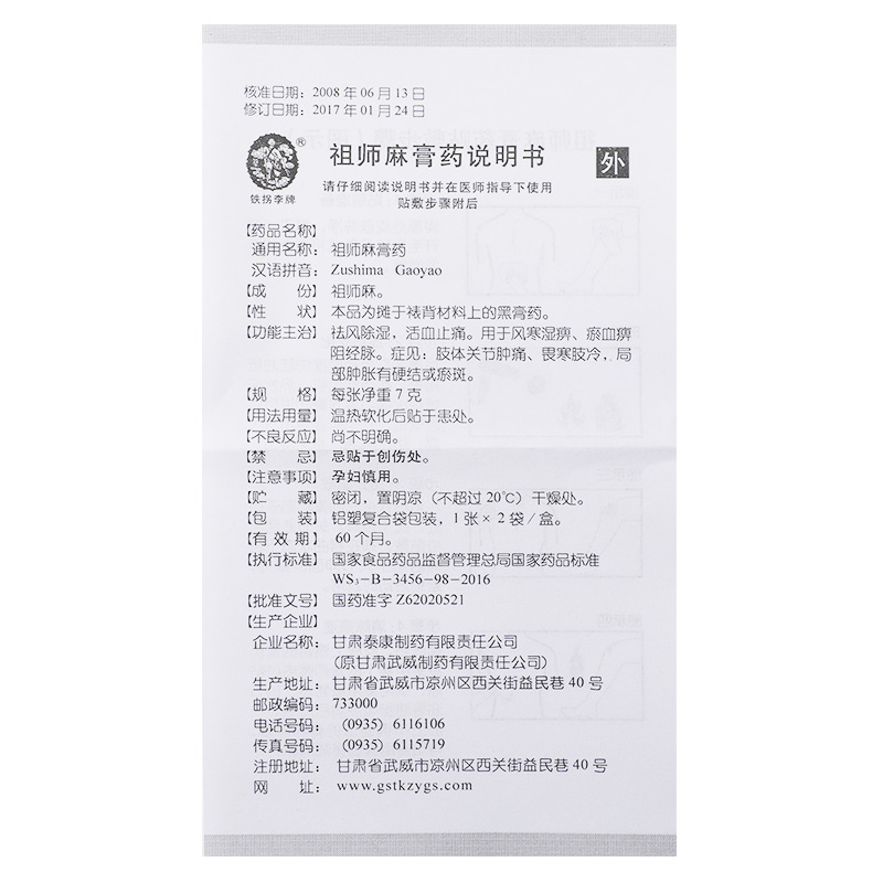 铁拐李 祖师麻膏药 1张*2袋/盒 祛风除湿 活血止痛 关节肿痛