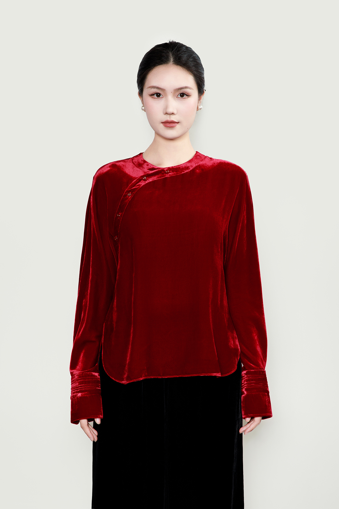 盛唐牡丹| 酒红色丝绒斜襟女上衣
