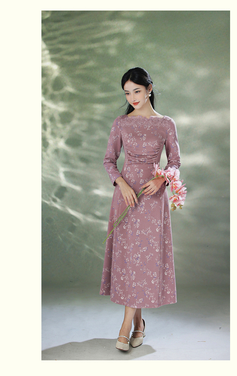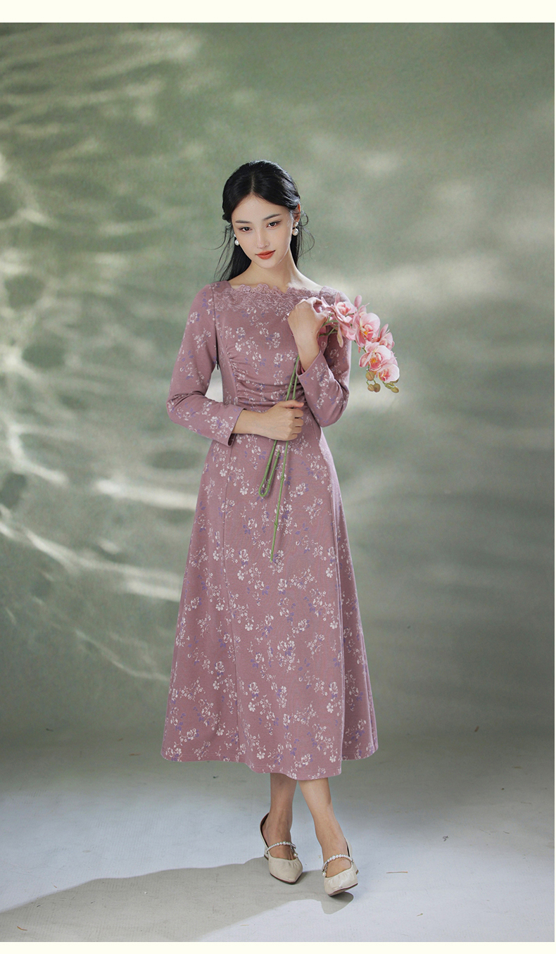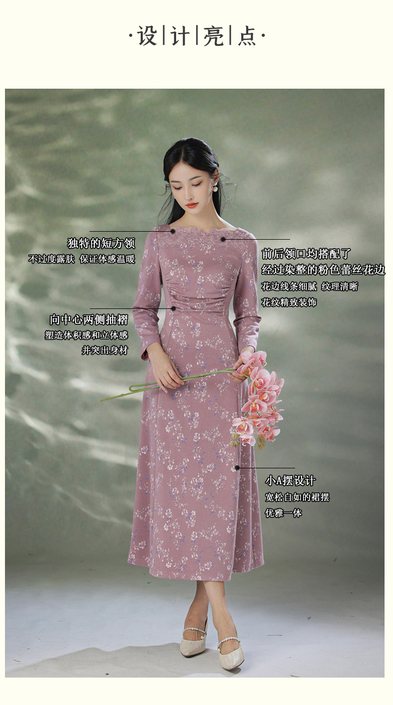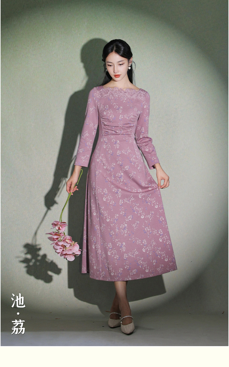 逸红颜池荔2025秋冬新款温柔淑女款弹力一字肩大摆复古连衣长裙女
