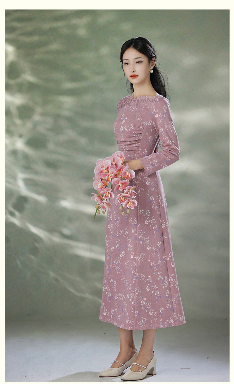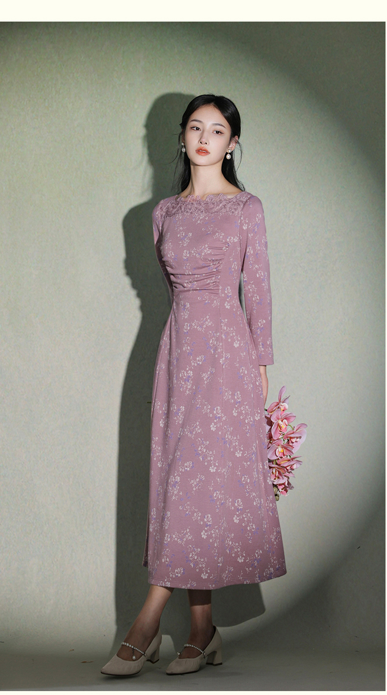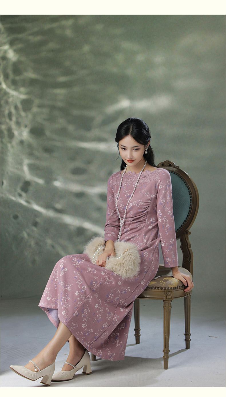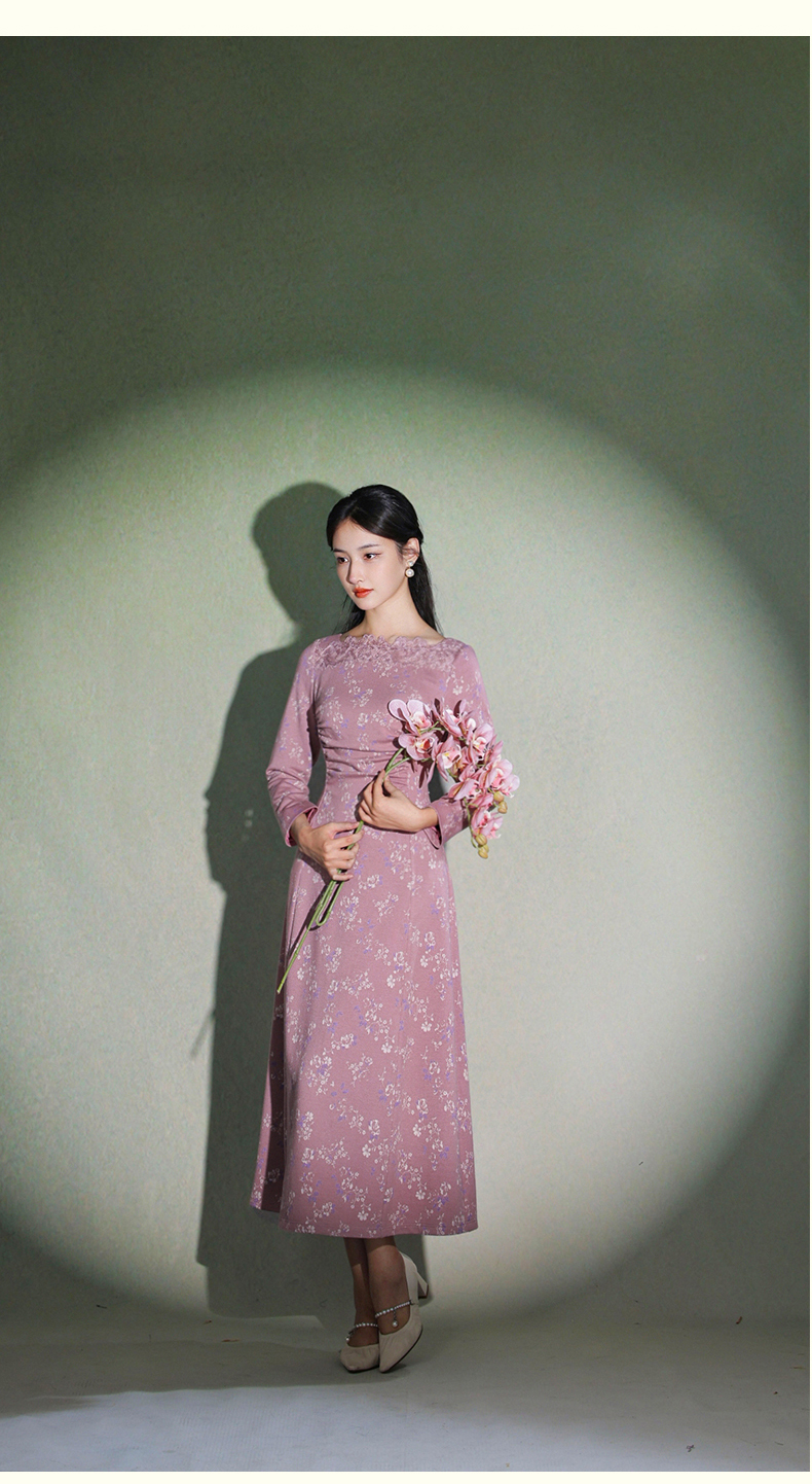 逸红颜池荔2025秋冬新款温柔淑女款弹力一字肩大摆复古连衣长裙女
