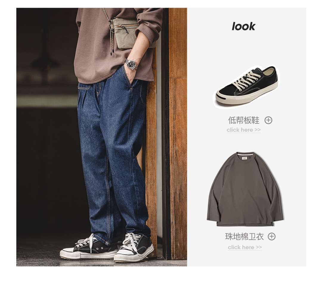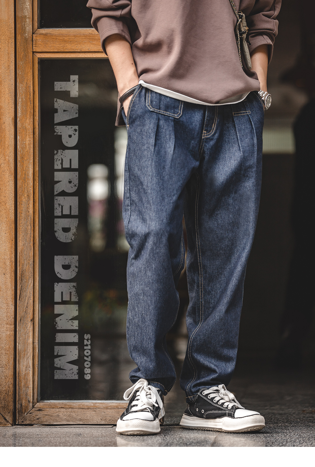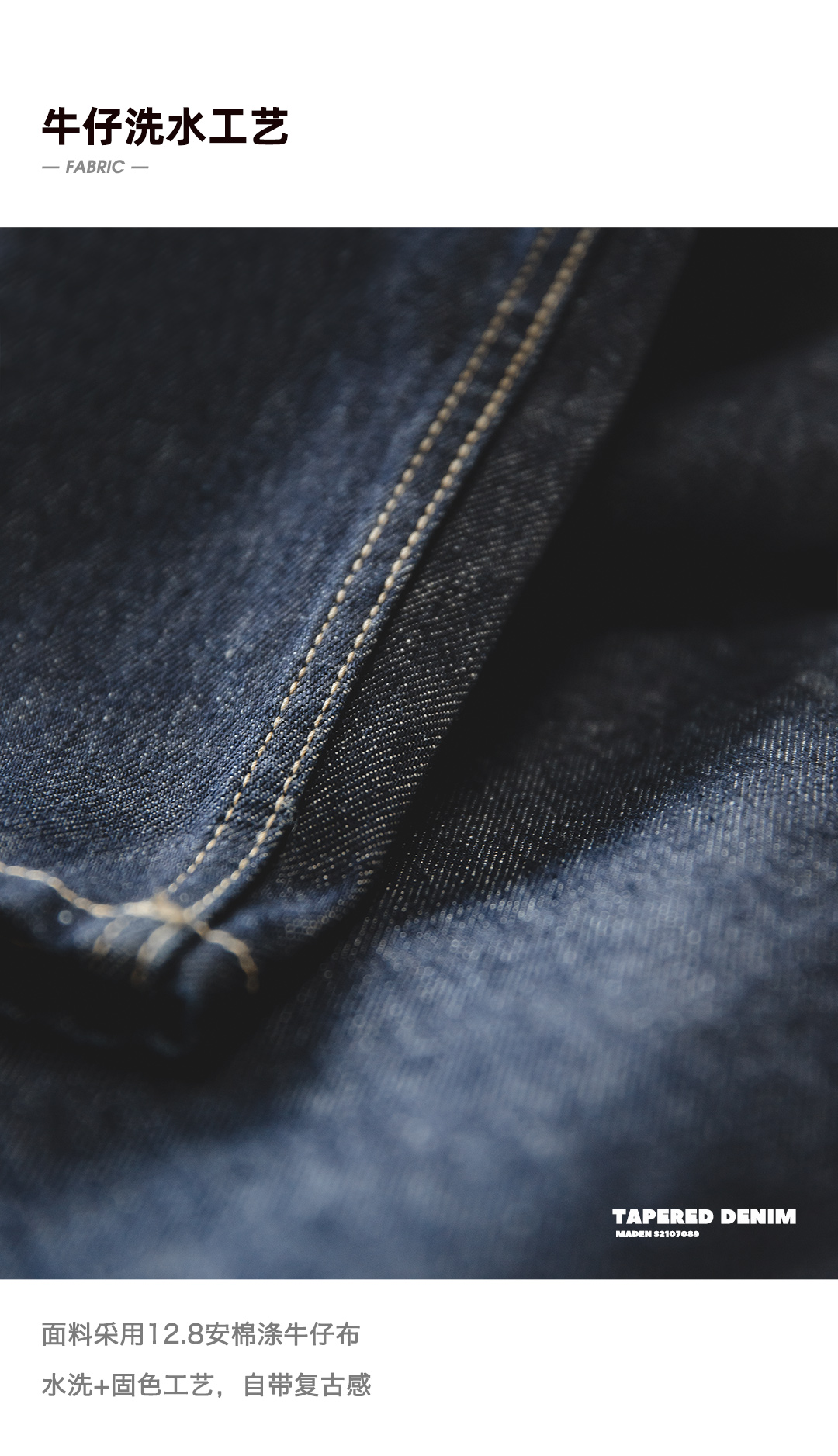 工装优选 日系复古丹宁水洗深色中腰锥形牛仔裤宽松长裤子男秋冬