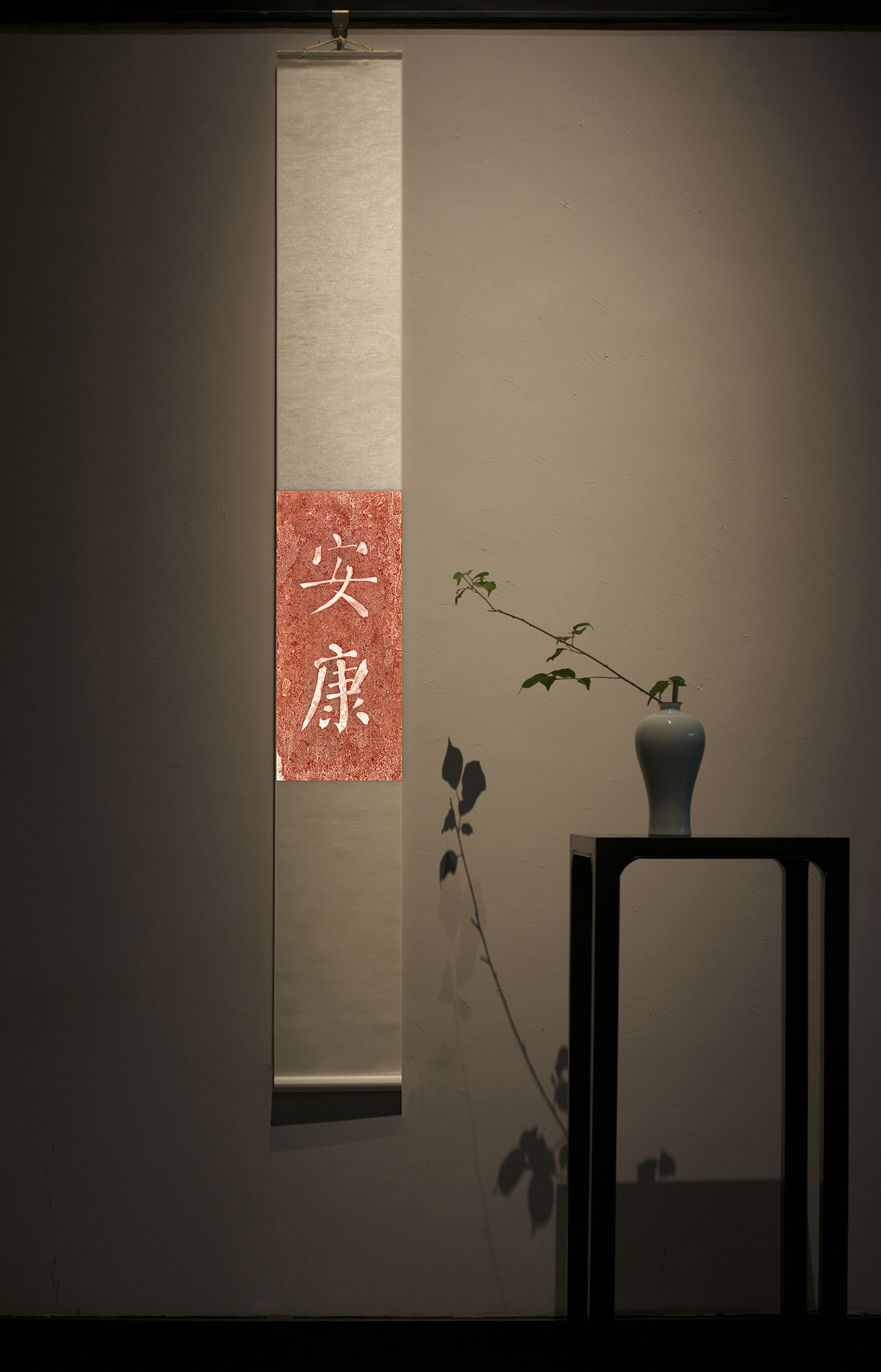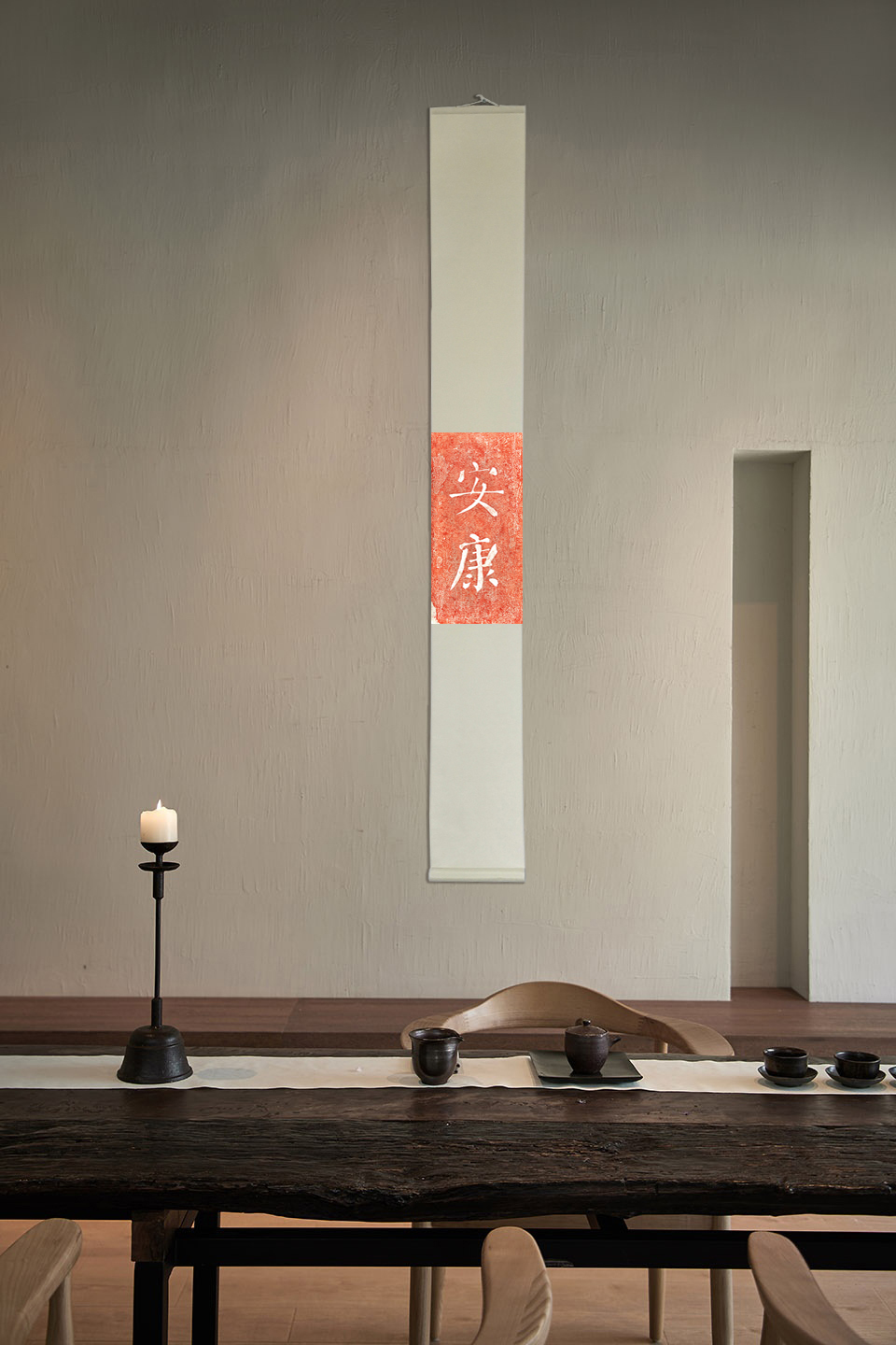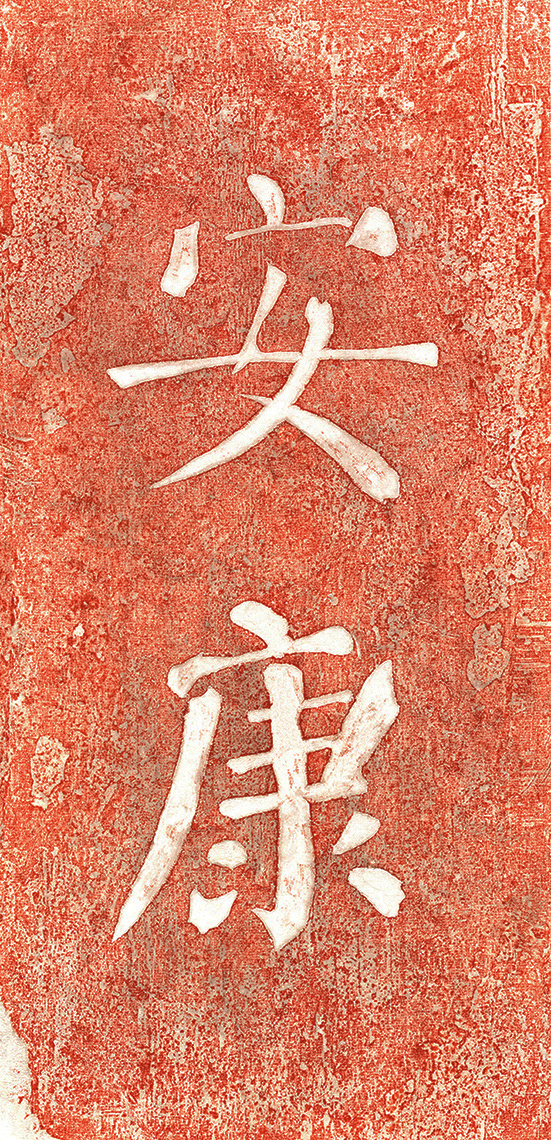 本幅作品集字平安和健康中的安康二字,是老百姓喜闻乐见的节日祝福语,书体选自颜真卿楷书代表作《多宝塔》,书写恭谨诚恳,点画圆整,端庄秀丽,一撇一捺显得静中有动,飘然欲仙。由行知亲自镌刻,刀法准确细腻,使原书法的神韵跃然石上。