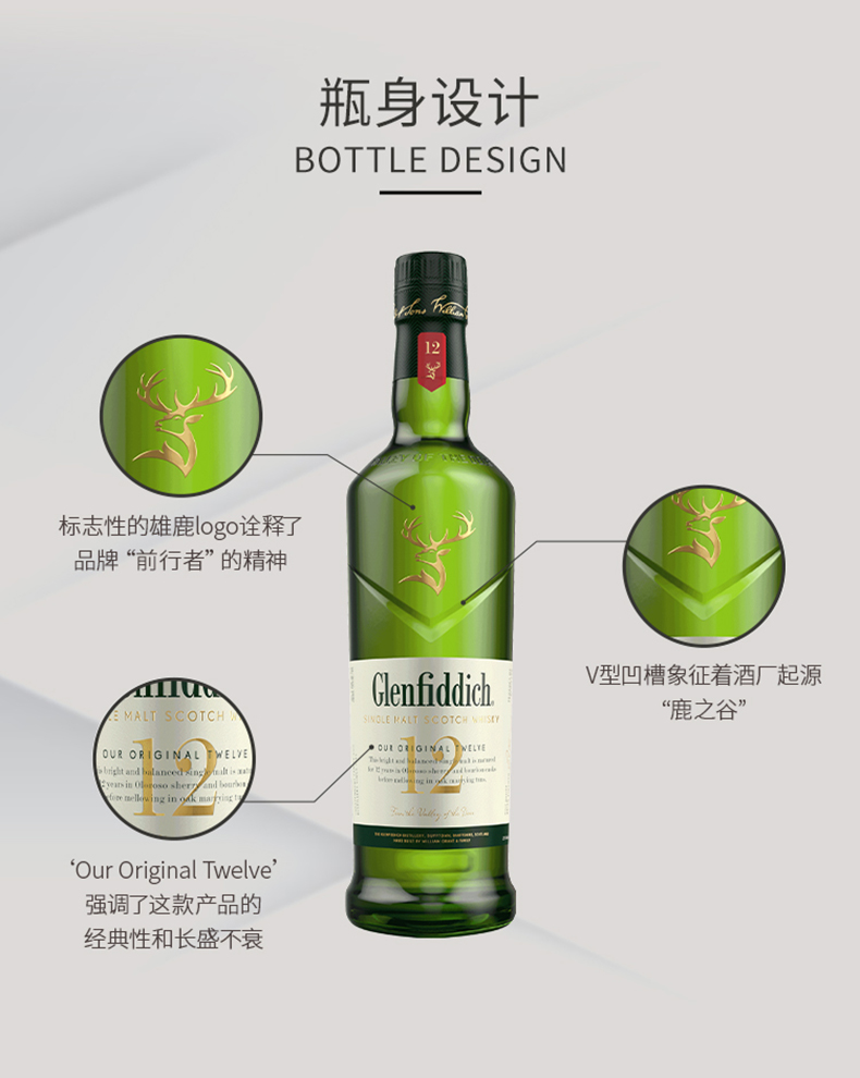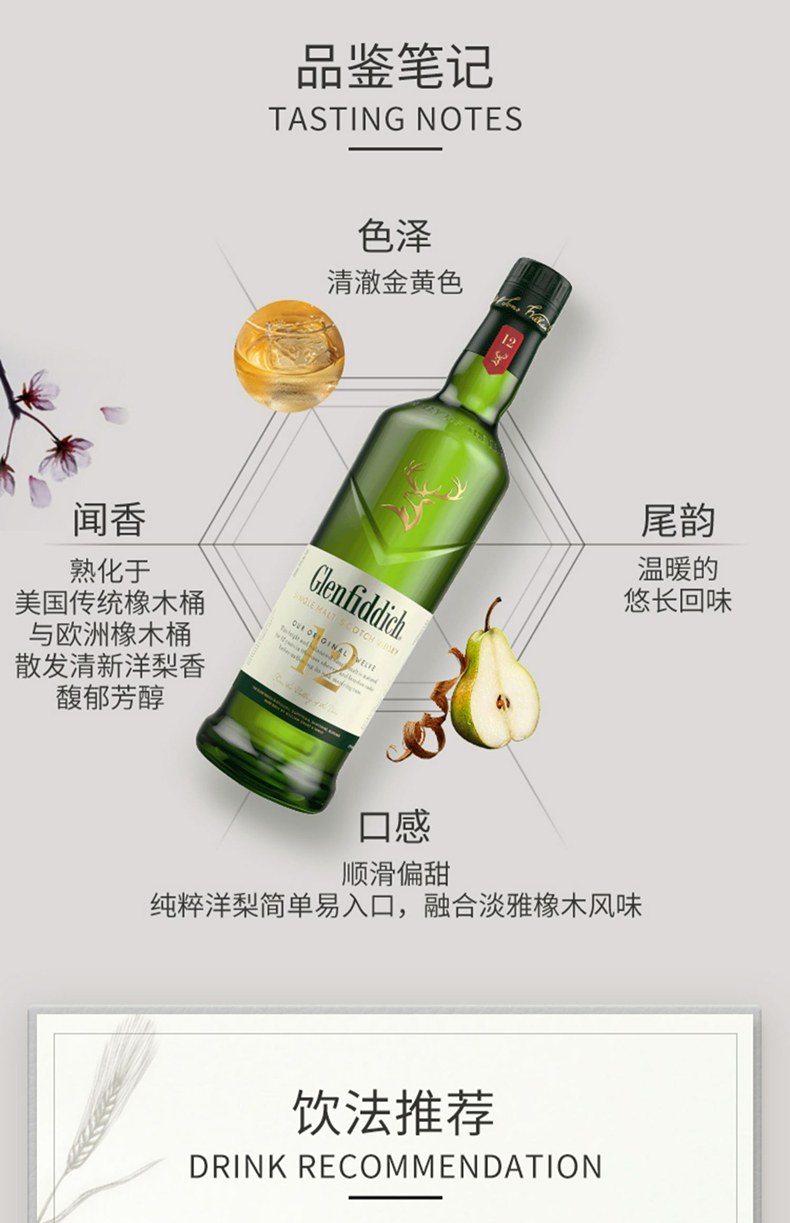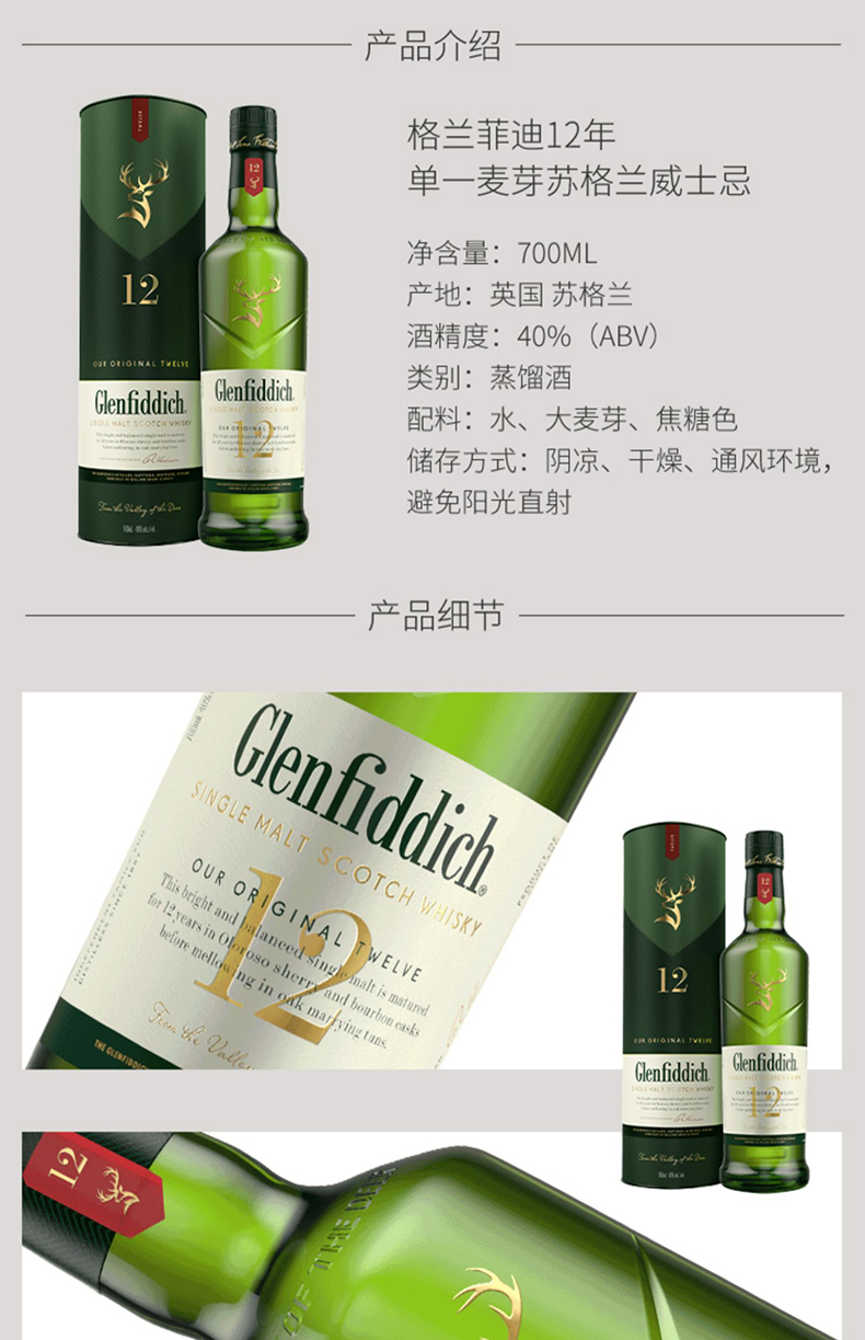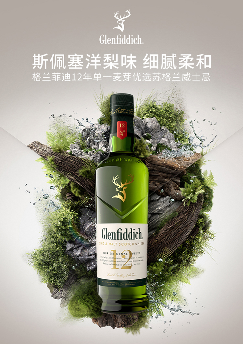 【Glenfiddich】格兰菲迪12年700ml 苏格兰单一麦芽威士忌纯麦