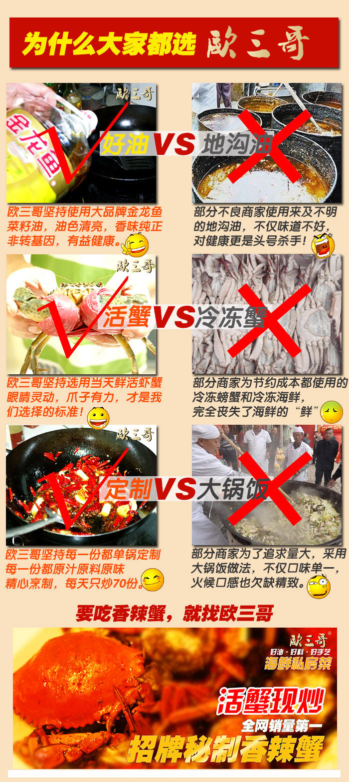 - 要吃香辣蟹 就找欧三哥 成都市自有门店 合法经营纳税 餐饮环境明厨亮灶,干净卫生,符合国家标准 淘宝开店四年始终坚持好品质 每日鲜活海鲜现做现发货 坚持每一份都单锅定制口味辣度 做只属于你的定制香辣蟹