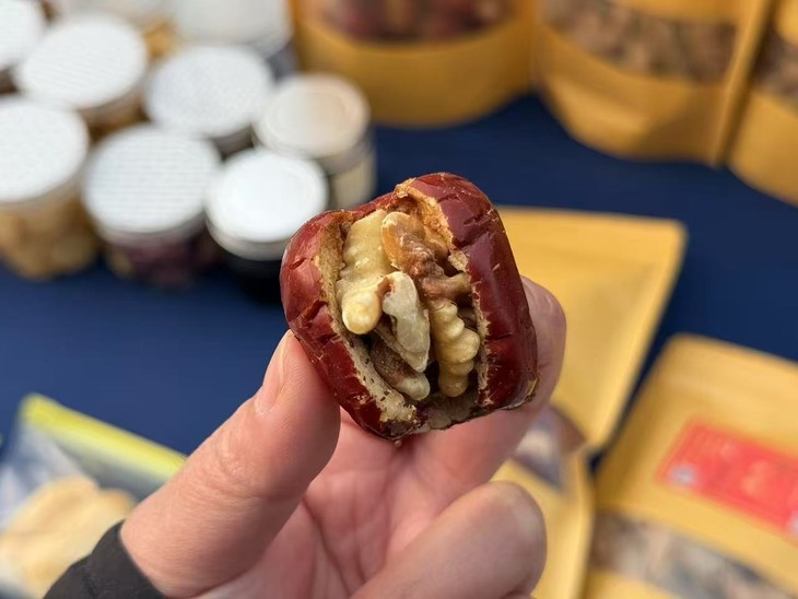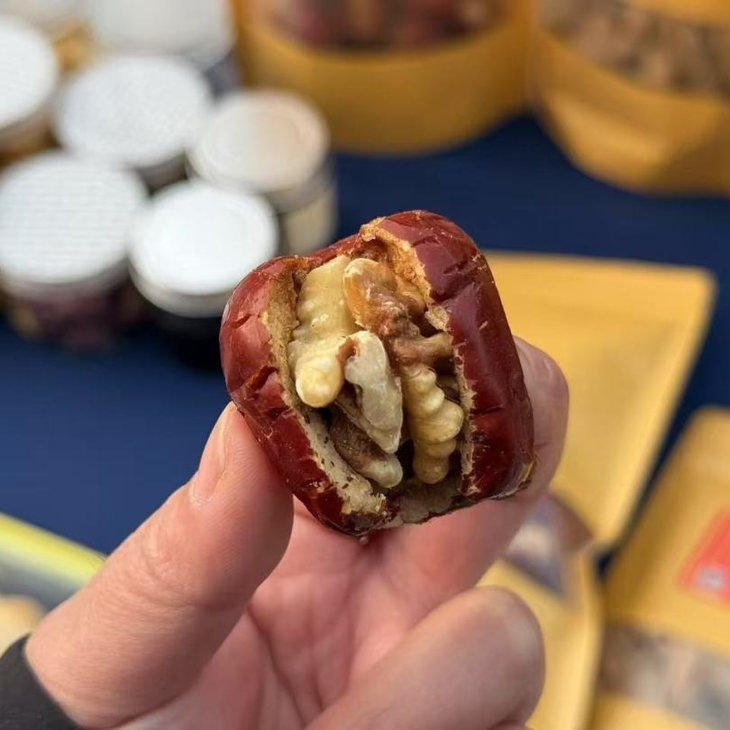 原料只有桃花石大枣和康丽的纸皮核桃,枣里夹上核桃仁,看着多简单,又一点儿都不简单。