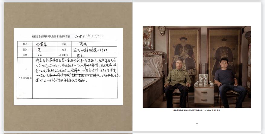 辽东边,自修建至今,历经六百载风雨,大多遗迹都难以辨识,但生活在辽东边两侧的人们心中,仍存在两条边墙,一条是地理意义上的物质文化遗存,一条是心理意义上的风土人情文化边界。我们历时3年,运用人类学田野调查的方式,进行样本的科学筛选,在边墙两侧各50公里范围内选取100人作为拍摄对象;在拍摄调研过程中,严格遵照田野调查的流程要求,进行走访拍摄。从设定调查主题到选择调查对象,从拟定调研提纲到现场采访拍摄,每一步都为了客观真实地留存影像文本。在艺术表现形式上,积极进行探索创新,采用文字、图片、手绘图稿相结合的方式,使跨门类的表达方式得到有机结合。这一切的努力,只为了让这片土地上万千子民的生产方式和生活状态得以全方位呈现。