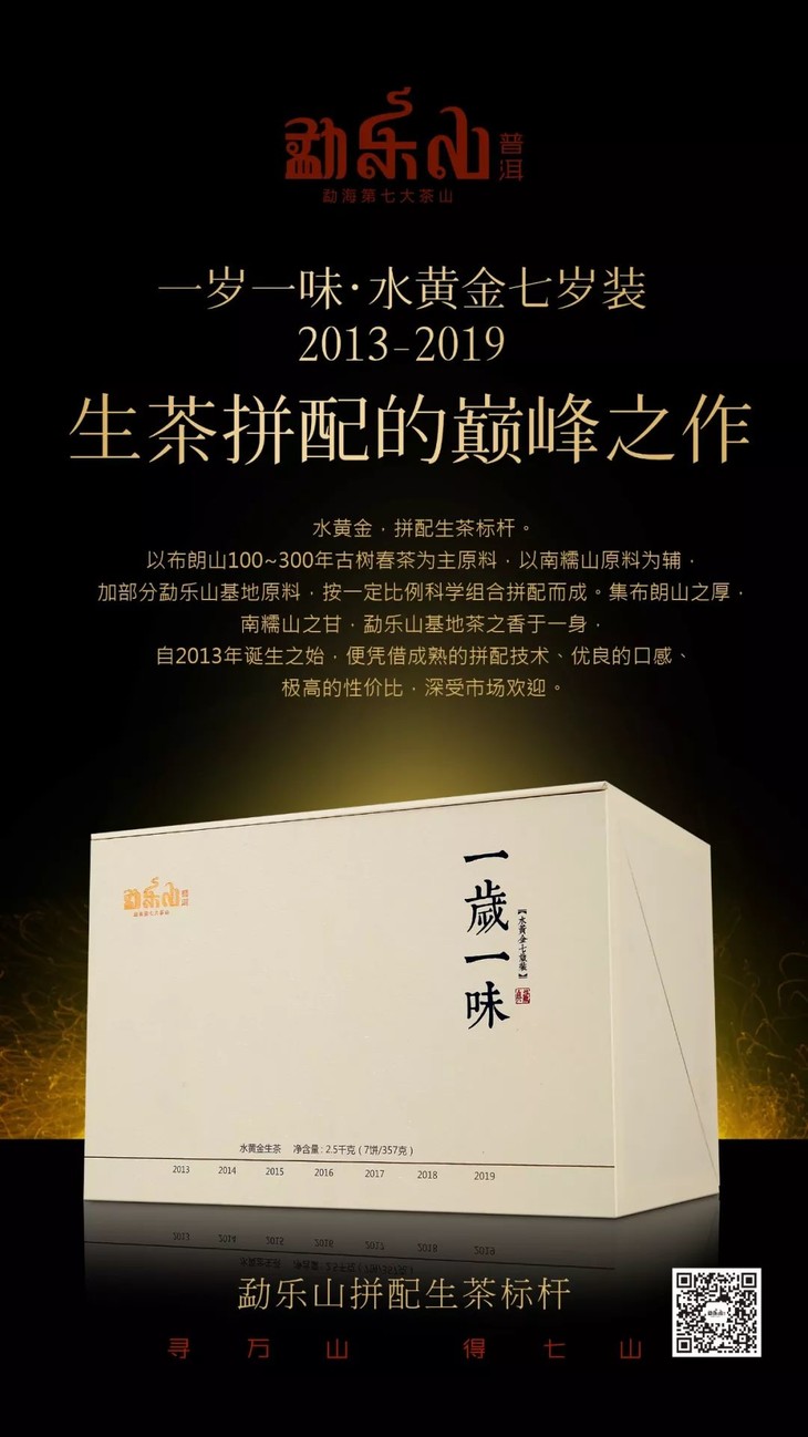 水黄金,拼配生茶标杆。以布朗山100~300年古树春茶为主原料,以南糯山原料为辅,加部分勐乐山基地原料,按一定比例科学组合拼配而成。集布朗山之厚,南糯山之甘,勐乐山基地茶之香于一身,自2013年诞生之始,便凭借成熟的拼配技术、优良的口感、极高的性价比,深受市场欢迎。