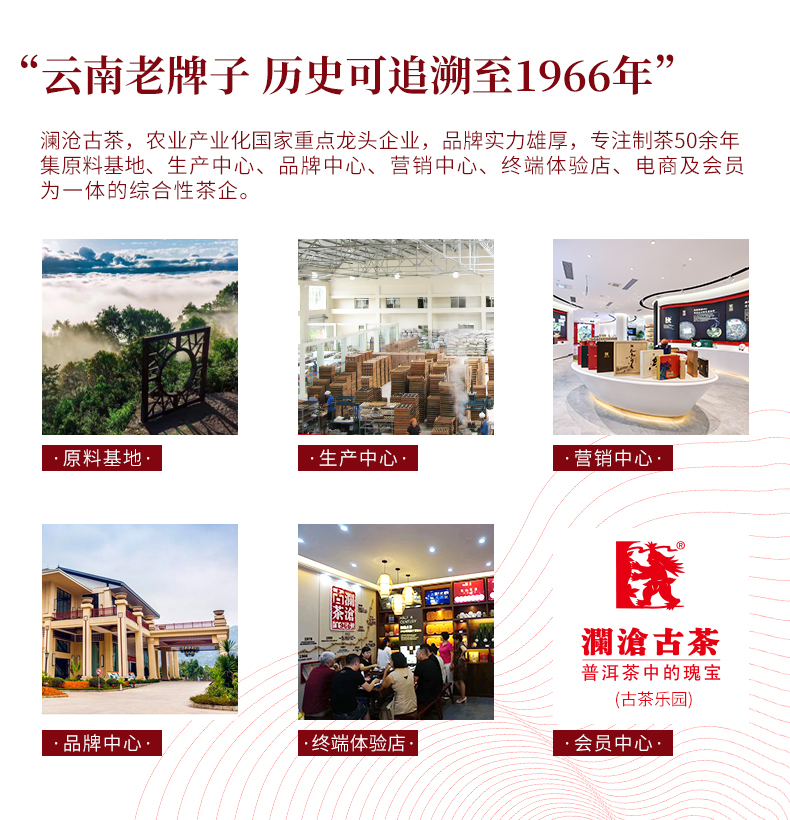 - 澜沧古茶,荣获“中国茶业百强业”,“农业产业化国家重点龙头企业”、“云南省普洱茶十大影响力企业”、“云南省食品安全示范单位”;拥“中国普洱茶十大品牌”、“云南老字号”等荣誉称号。