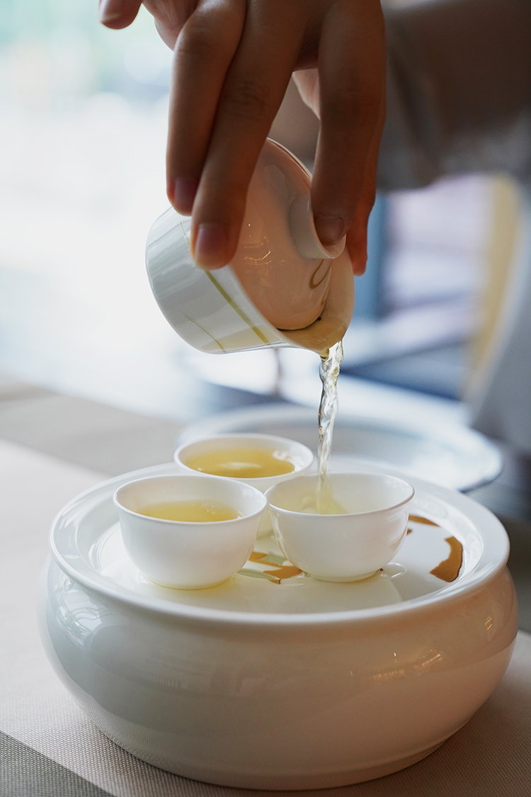 用沸水温茶具,使茶具均匀受热。沸水高冲,快进快出。