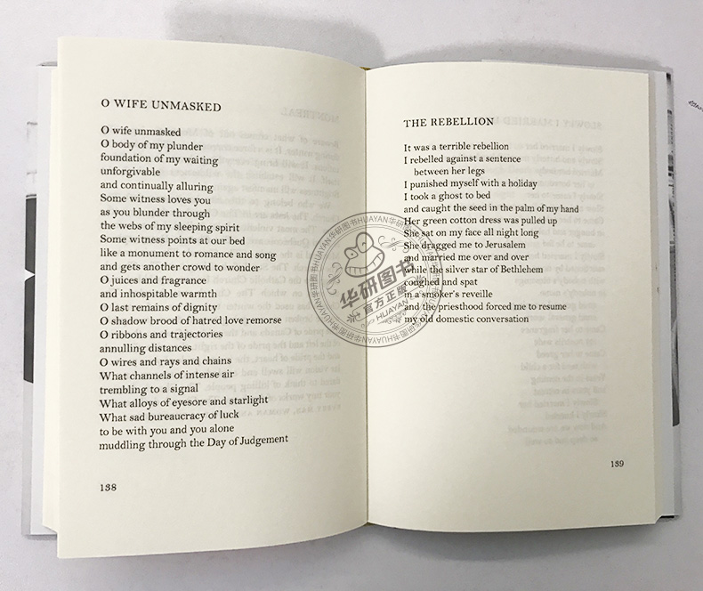 Leonard Cohen: Poems and Songs《莱昂纳德·科恩:诗歌与歌词》这本诗集精选了他五十年来有影响力的作品,包括:Suzanne, Sisters of Mercy, Bird on the Wire, Famous Blue Raincoat和I’m Your Man等传奇歌曲,以及 Flowers for Hitler, Beautiful Losers和Death of a Lady’s Man等诗歌。