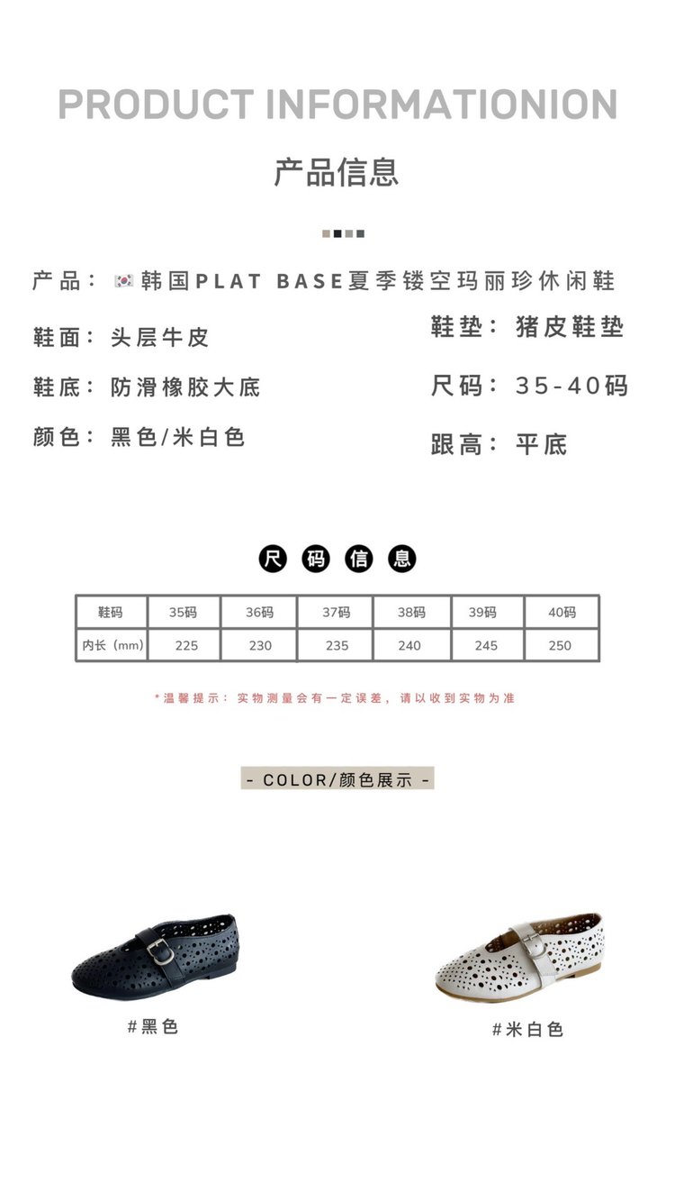 【品名】韩国PLAT BASE 夏季镂空玛丽珍休闲鞋 舒适透气 时尚百搭 【规格】黑色、白色 【尺码】35-40 【产地】国内 【材质】 鞋面材质:头层牛皮 鞋底材质:防滑橡胶大底 【发货包装】独立包装盒 【发货地】浙江 【发货快递】申通 【不发货区域】新疆、西藏、港澳台 【发货时效】48-72小时,周末节假日顺延 |
