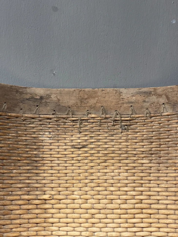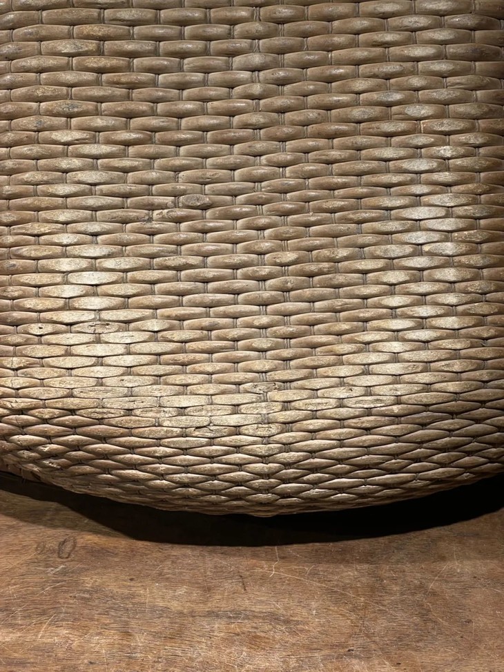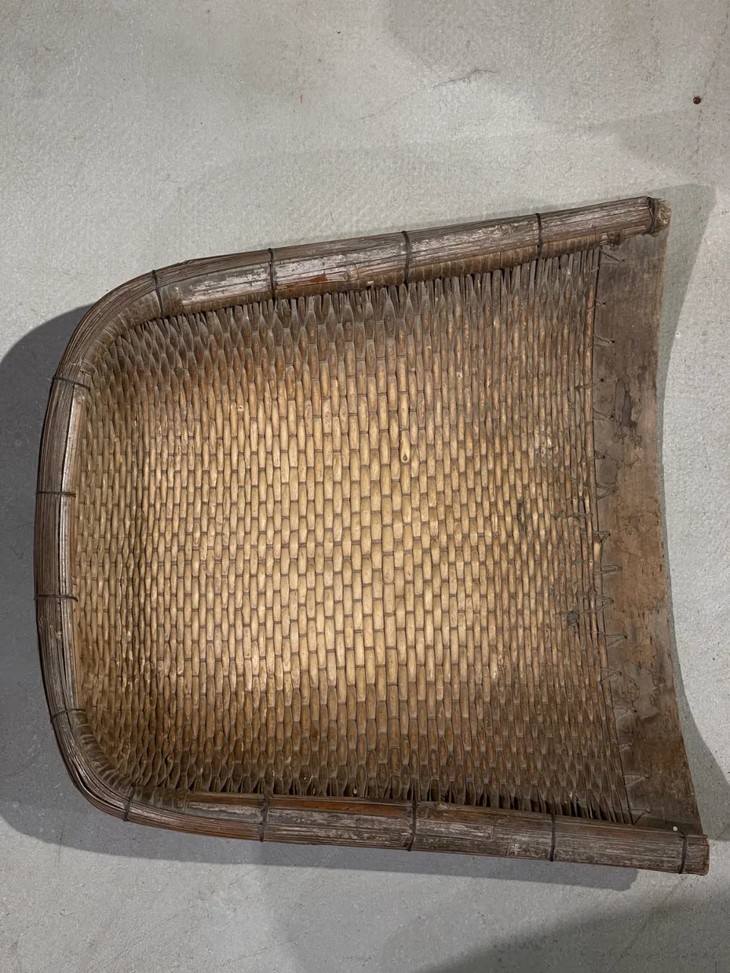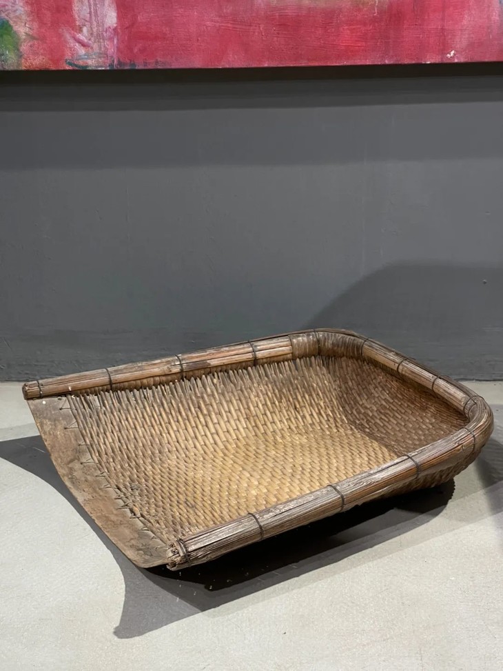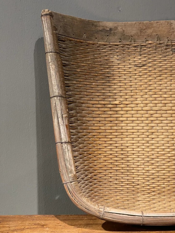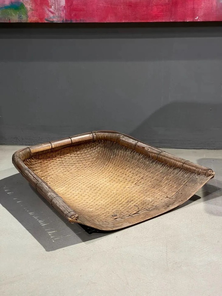 这是一件造型独特典雅,制作精美、坚固实用、年代久远的竹架蒲草编老簸箕,整体设计风格简约大气,以竹条为支架蒲草编织而成的老簸箕,逾百年之使用仍然保持坚固完整,是清代之精美传统型式老簸箕,如今可摆放于当代空间内,因其独特风格与精采之细节,可以与各种空间搭配,甚至可以实用当花器、收纳展式容器,或是持续以簸箕功能使用,真正体现用之美的真谛。