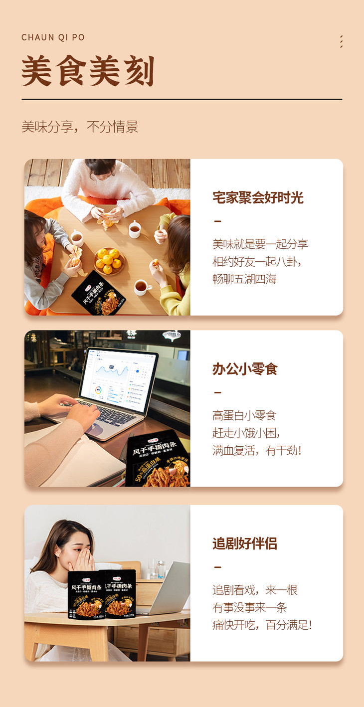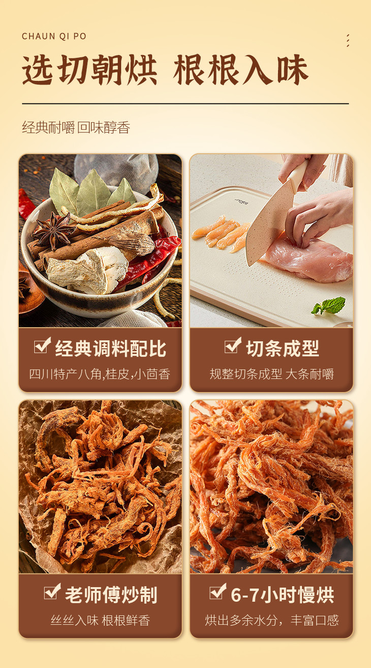 | 【品名】川七婆风干手撕鸡肉条 【规格】拍1发5 100g/袋 【保质期】10个月 【禁食人群】婴幼儿 【储存条件】密封置于干燥处 【产地】广东揭阳 【发货地】广东揭阳 【发货快递】邮政 【不发货区域】新疆、西藏、港澳台地区不发货 【发货时效】48小时,节假日顺延 |