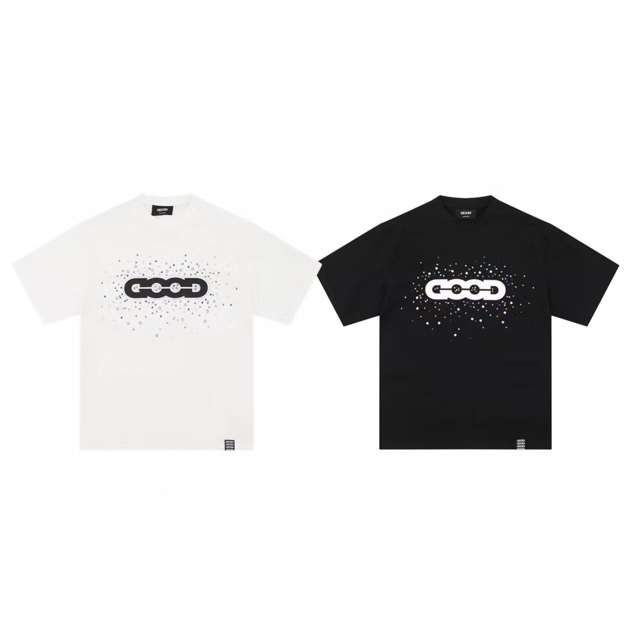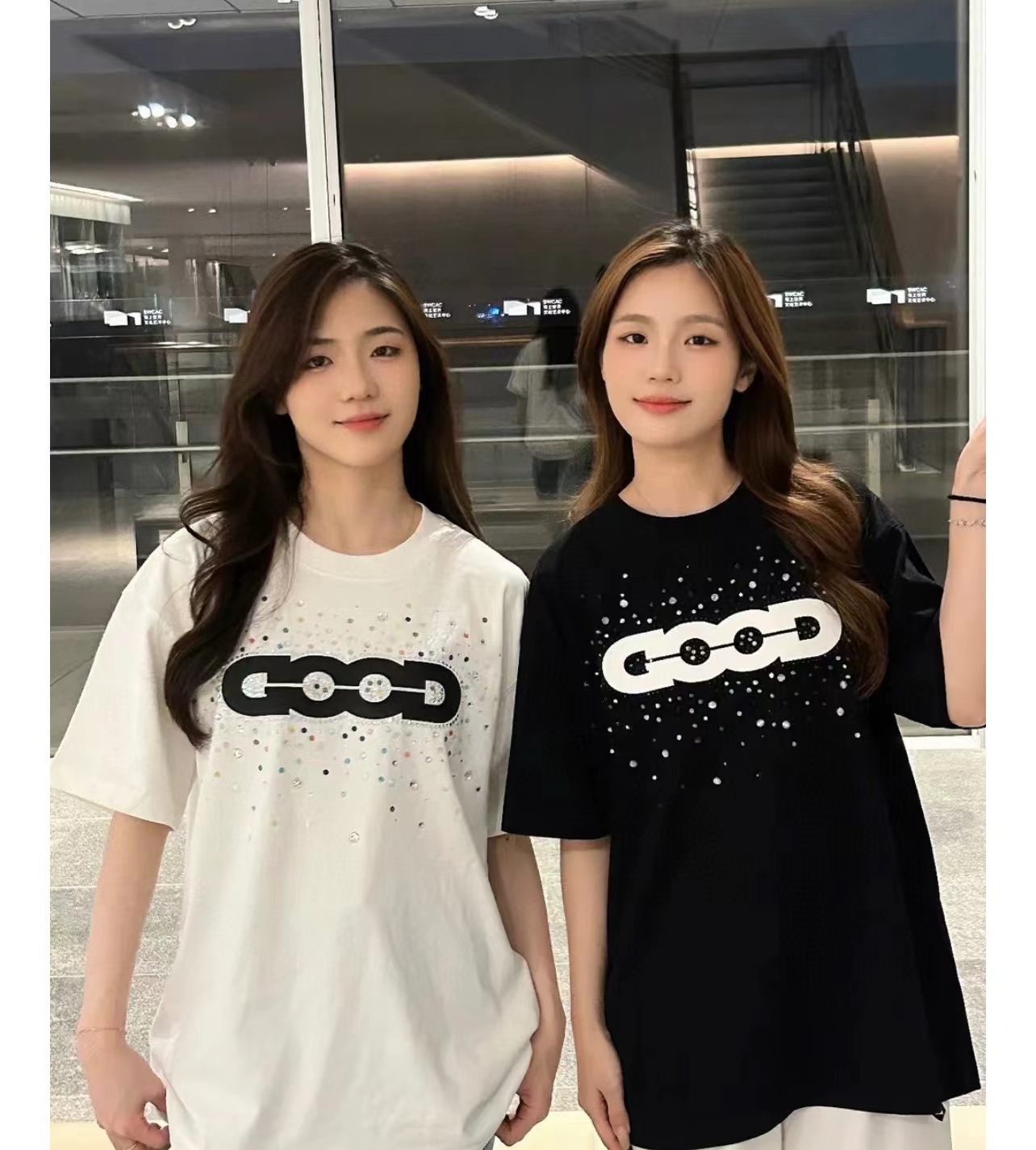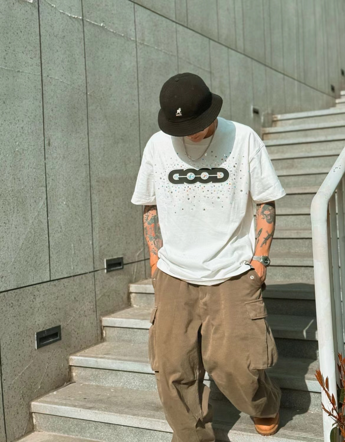 老白同款假日缤纷糖果宝石猫眼石情侣圆领短袖T恤 采用32支紧密双纱280g面料 独特剪裁宽松显瘦 定织定染同版紧密螺纹~胸前字母采用立体胶印 周围镶嵌各种克拉小彩钻 工艺复杂 耗时耗力 后领口定制原版五金字母纽扣 下摆缝制并排字母大标 凸显整衣特点 大厂做工