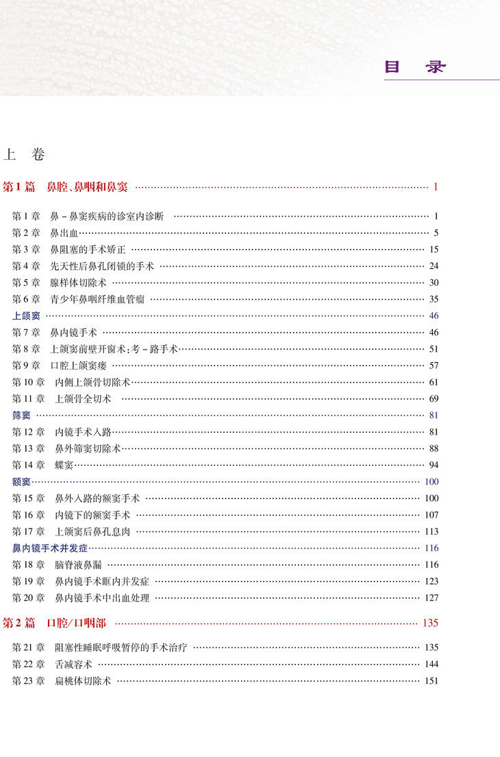 本书分为上、下两卷,共计15部分, 131章,内容包括:鼻腔、鼻窦和鼻咽部,口腔,喉部,下咽及颈段食管,唾液腺,甲状腺和甲状旁腺,气管和纵隔,颈部,整形外科,眼眶手术,颅底外科,鼓膜、中耳和乳突,面部神经和颞骨等。该书内容全面、深入,系统地介绍了耳鼻咽喉头颈外科各种手术技术,并涵盖了各种手术的最新技术和操作要点。书中还配有大量珍贵的临床手术彩色图片,直观易懂,对耳鼻咽喉头颈外科医生临床手术具有重要参考价值,对促进我国耳鼻咽喉头颈外科诊治水平的提高具有积极的促进作用。