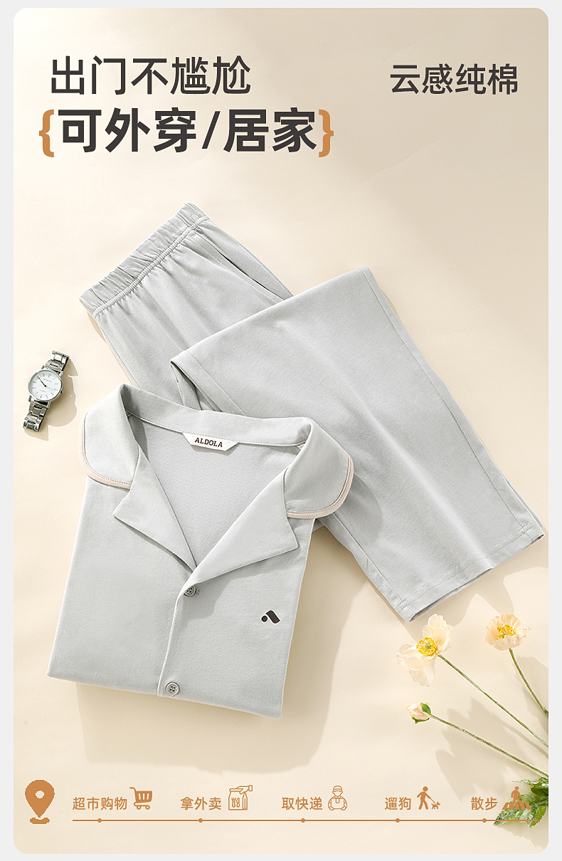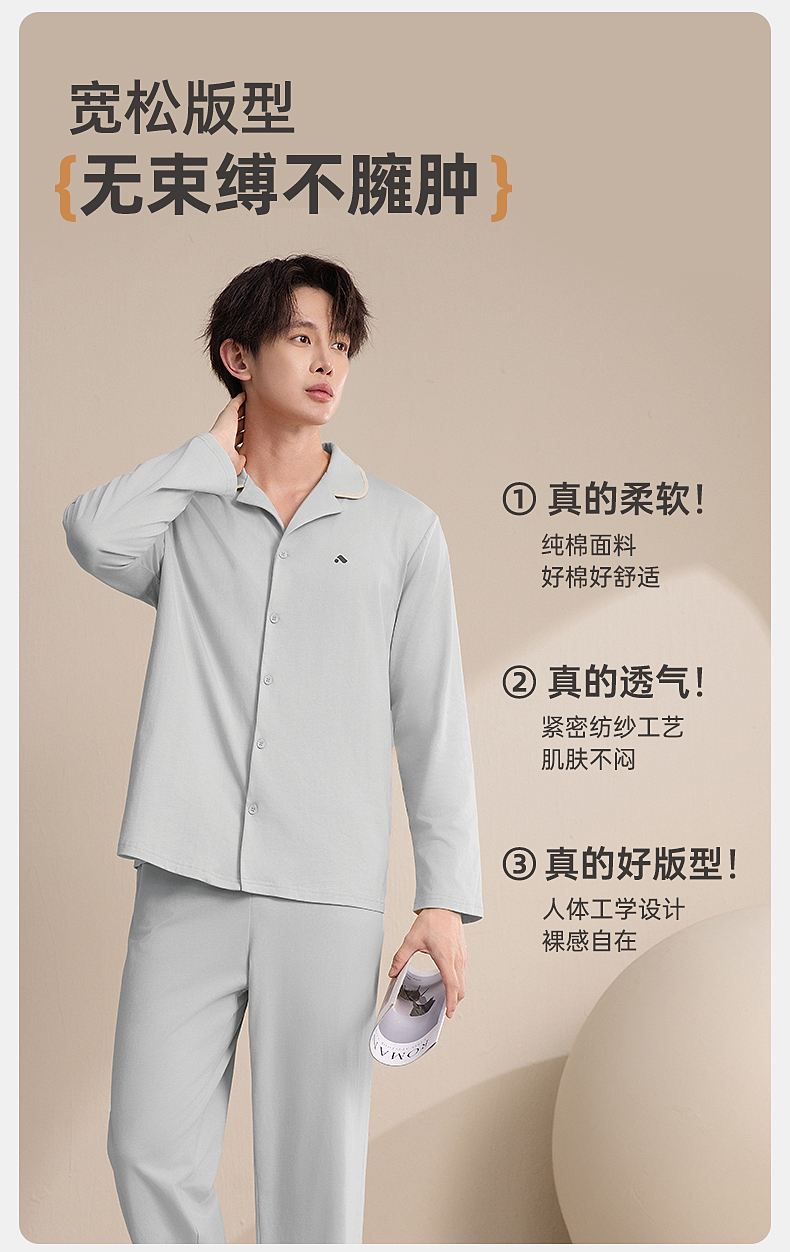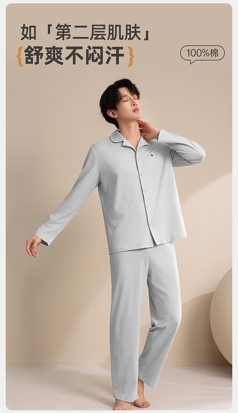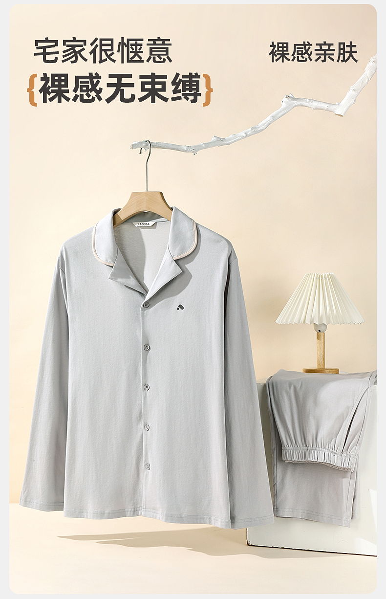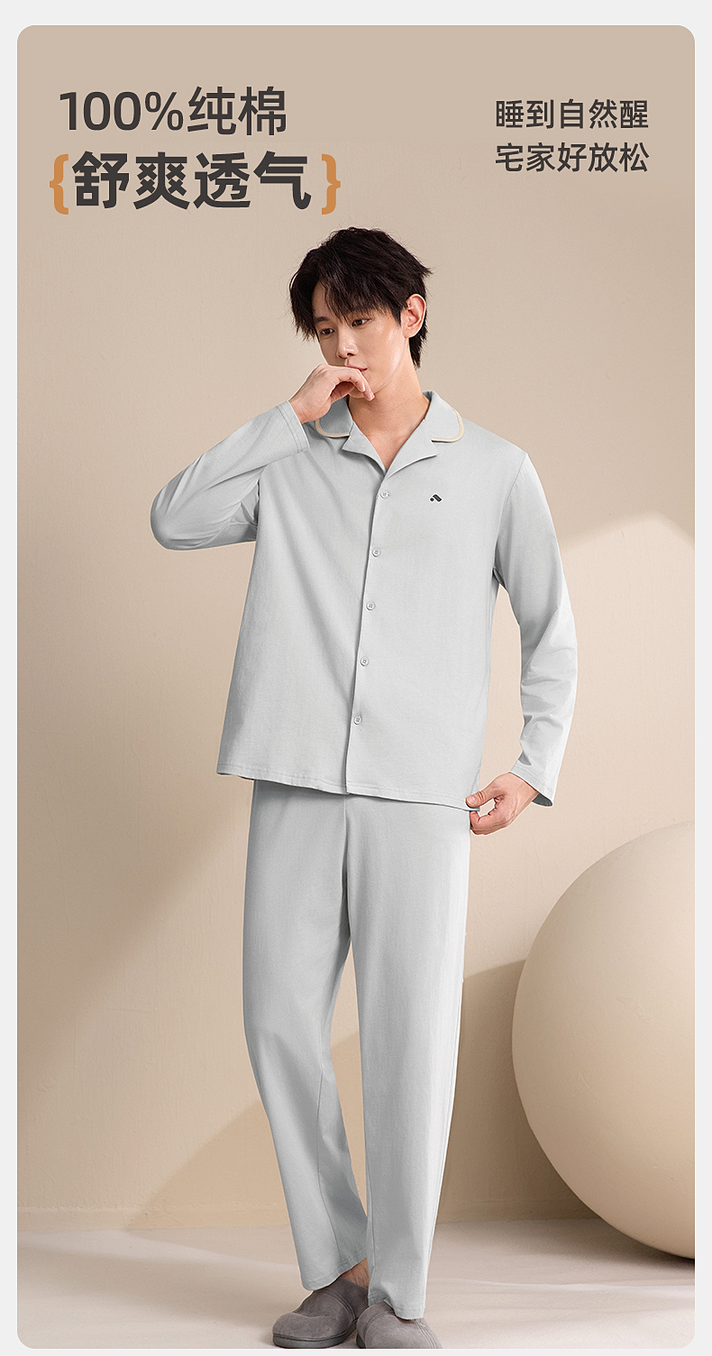 雅黛俪男士家居服套装纯棉舒适透气长袖长裤居家开衫睡衣套装