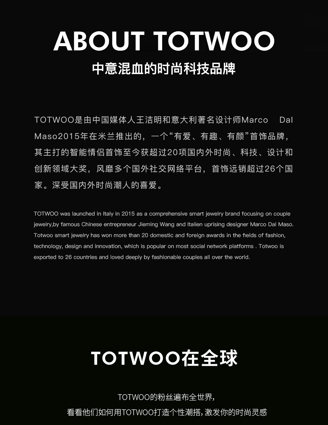 - TOTWOO-代表未来的智能珠宝,诞生于意大利米兰,是世界上首个融社交、科技和时尚于一体的智能珠宝。