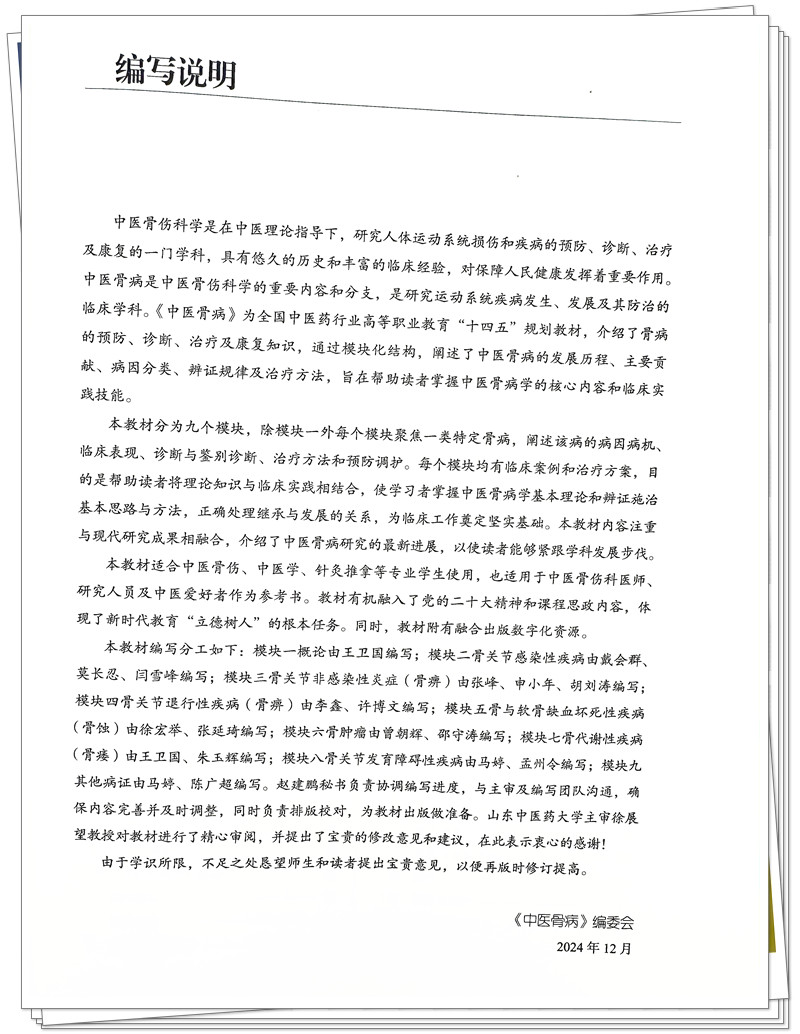 通过本教材的学习,读者将能够掌握中医骨病学的基础理论,熟悉各类骨病的病因、诊断及治疗方法,了解中医骨病的历史背景和发展趋势,为未来的临床实践和学术研究打下坚实的基础。