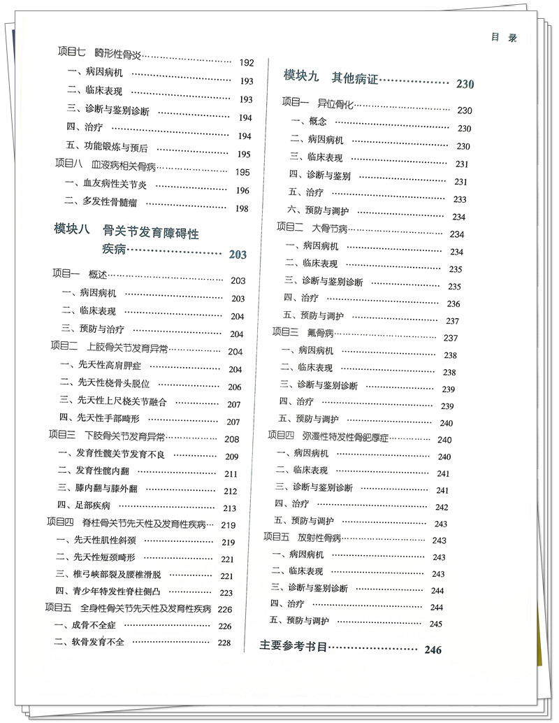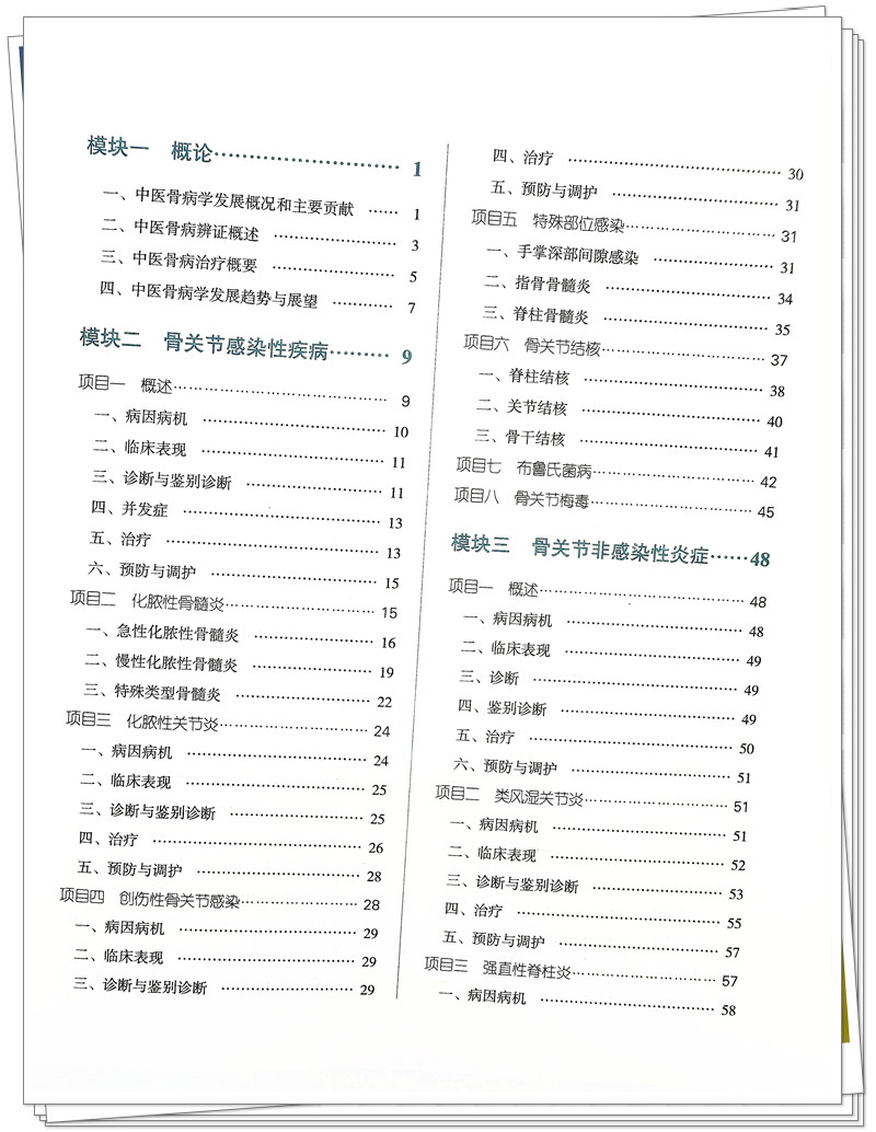 本教材共分为八个模块,每个模块聚焦一类特定的骨病,从病因病机、临床表现、诊断与鉴别诊断、治疗方法到预防调护,进行了详尽的阐述。模块一概述了中医骨病学的基础理论和发展概况;模块二至模块七分别探讨了骨关节感染性疾病、非感染性炎症、退行性疾病、缺血坏死性疾病、骨肿瘤、骨代谢性疾病及骨关节发育障碍性疾病;模块八则涵盖了其他特殊类型的骨病。