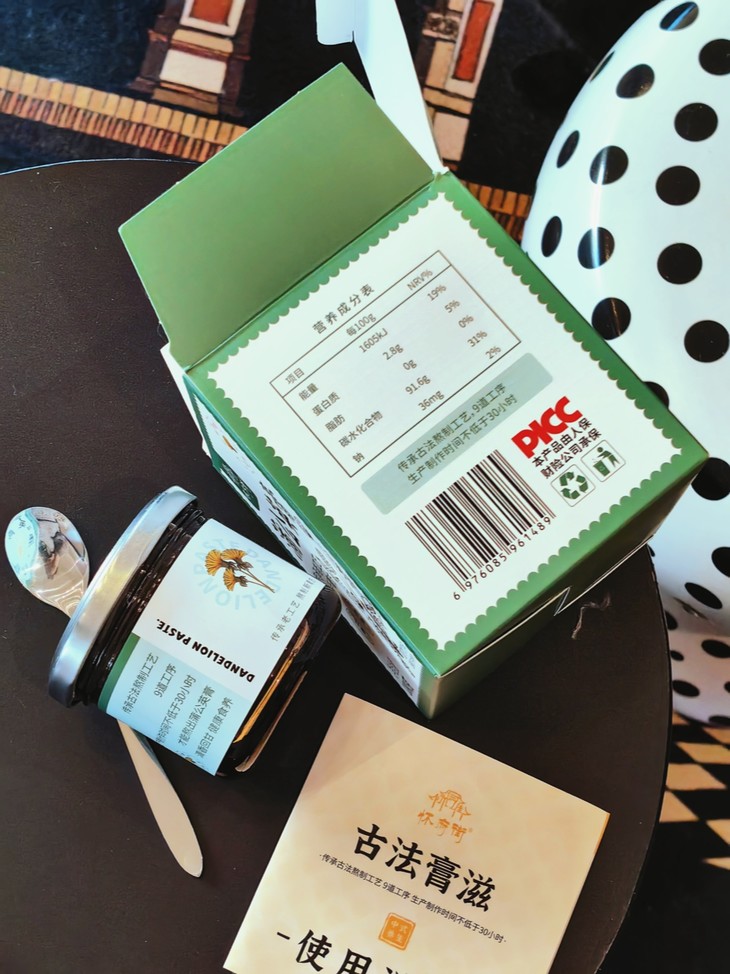 在制作上,蒲公英膏也相当用心。来自太行山深处的天然蒲公英,河南温县正宗的铁棍山药等等,真材实料,再遵循古法传承工艺,低温慢火熬煮30个小时,慢浸长泡、煎汁萃取、熬制浓缩、秘调收膏、罐装密封,最大程度保留植物的营养。在生产过程中也拒绝添加色素、甜蜜素、增稠剂和防腐剂等,确保了膏方的品质。