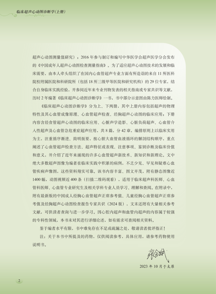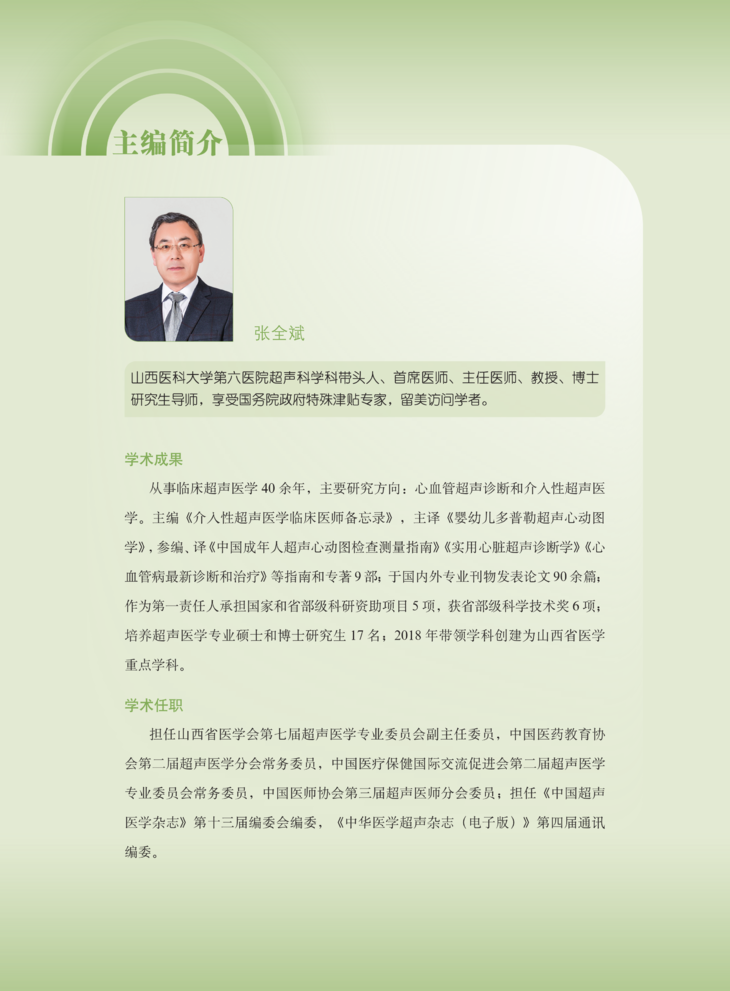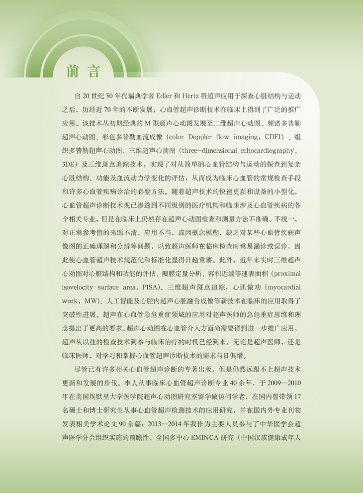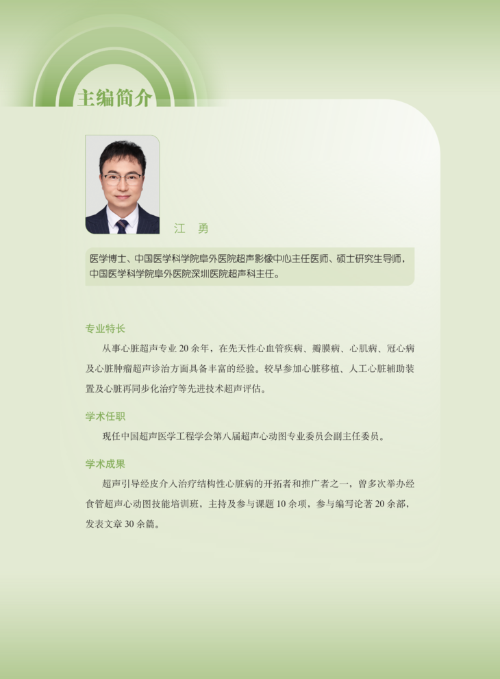 为了适应超声心动图技术的发展和临床需要,由张全斌教授牵头组织了在国内心血管超声专业方面有所造诣的来自11所医科院校附属医院和科研院所(包括18所三级甲等医院和研究机构)的29位专家,结合自身临床实践经验,并参阅近年来专业刊物发表的相关指南或专家共识等文献,历时2年编著《临床超声心动图诊断学》一书。本书分上、下两册,上册包括超声的物理特性和心血管超声成像原理、超声心动图检查技术、经胸超声心动图的临床应用;下册有经食管超声心动图的临床应用、心脏声学造影、心脏负荷超声、心血管介入性超声及心血管急危重症超声应用总共八篇42章。编排上原则以临床实用为主,遵循循序渐进、简明扼要,按心血管血液循环解剖结构的顺序,重点阐述心血管疾病超声检查方法、超声特征或表现、注意事项、鉴别诊断及临床价值和意义,并介绍超声心动图新技术、新知识和新理论。文中绝大多数超声图像为编者在临床实践中积累的病例,不乏许多少见、罕见及疑难心血管疾病的病例声像图,这些资料翔实可靠。该书内容丰富,图文并茂,附有静态图像1400余幅,动态视频近400条(扫描二维码可以观看),适于临床超声医生、心血管医生、心血管专业研究生及相关学科专业人员学习、理解和查阅。在附录中附有最新版的中国成人经胸心血管超声正常参考值、儿童经胸心血管超声正常参考值以及经胸超声心动图检查报告专家共识(2024版),文末还附有大量相关参考文献,可供读者查询与进一步学习。