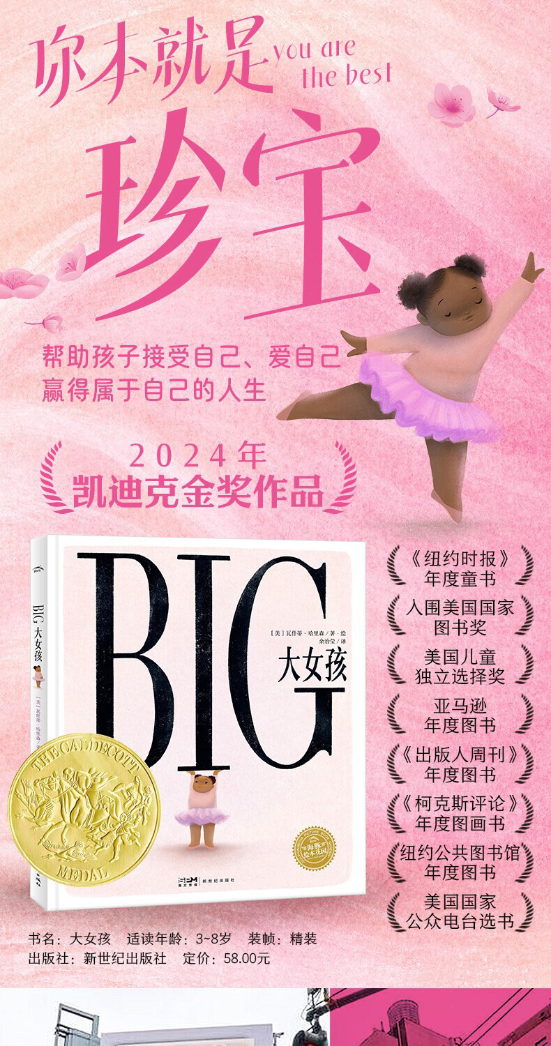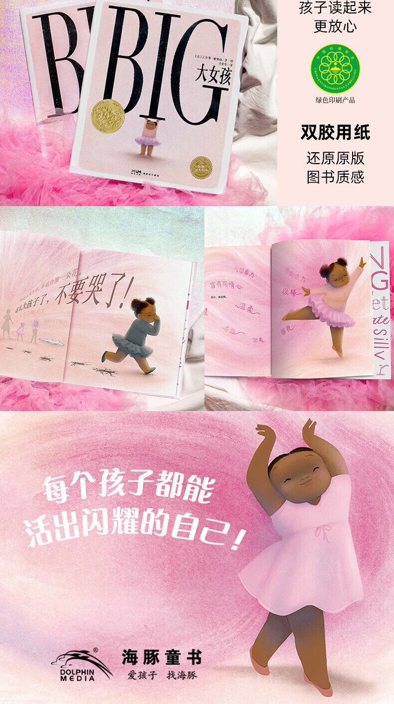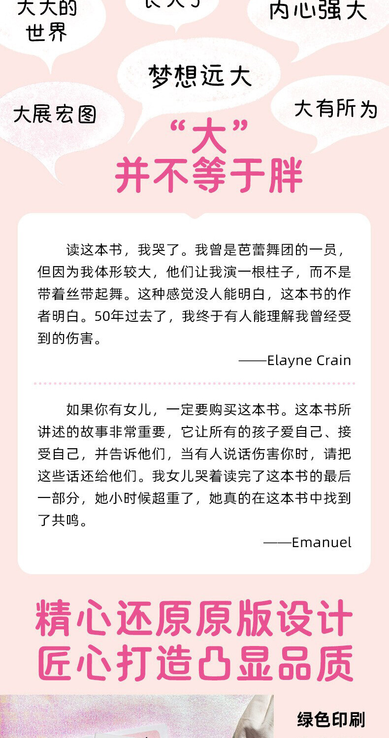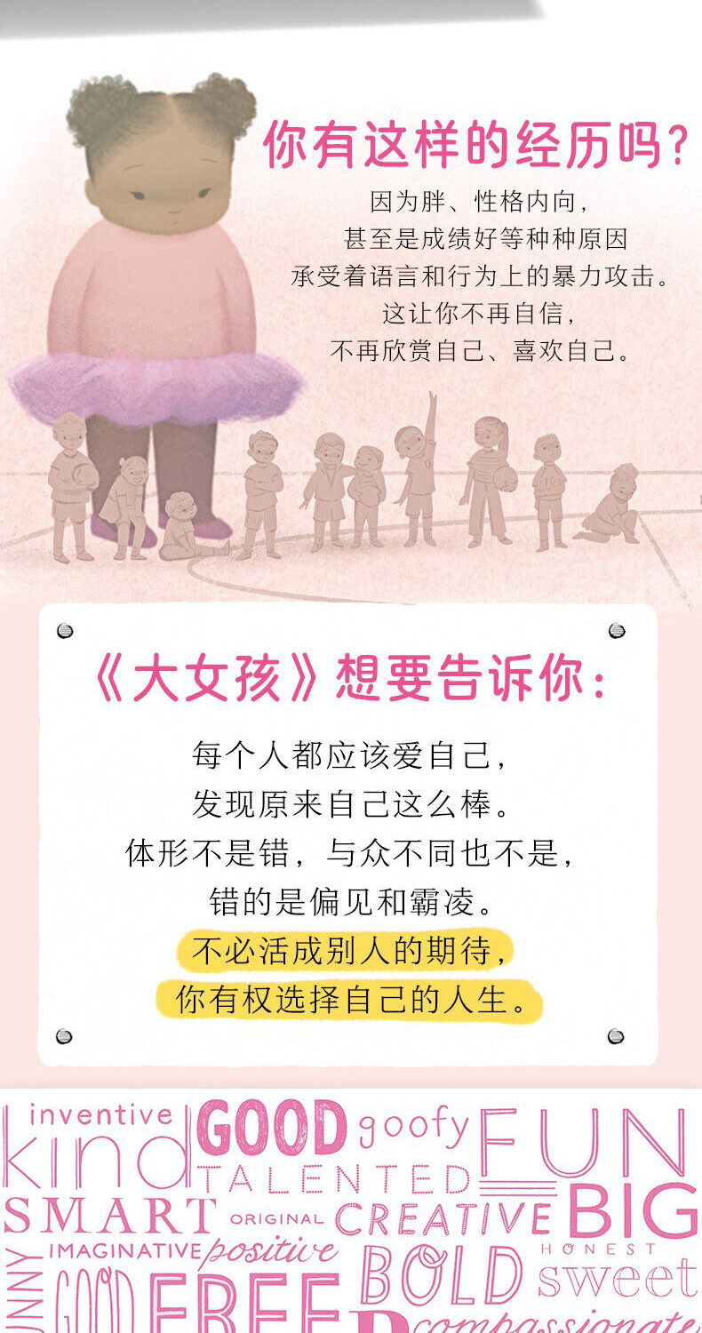 “我是个胖女孩,这有错吗?学校的芭蕾舞表演要开始了,别的女孩子可以演粉色的雏菊和玫瑰,老师却让我演一座乌云大山。当我卡在秋千上,没有人来帮我,有的只是嘲笑:‘你看她,简直像一头鲸鱼一样!’这些话就好像刻在我身上一样,怎么也抹不掉。” 很多女孩都有这样的经历:她们因为胖、矮、有颗痣被嘲笑,也可能是因为性格内向,甚至是成绩好,而承受着语言和行为上的暴力攻击。而这些偏见和霸凌给孩子带来的影响,很可能是一辈子的,她们不再自信、勇敢,不再是那个勇敢做自己的女孩了。 2024年凯迪克金奖图书《大女孩》是国内第一本关注胖女孩的反霸凌绘本。这本书为一些还在迷茫的胖女孩,也是未来的“大女孩”指路。体形并不是错,与众不同也不是,错的是那些偏见和霸凌的话语和行为。 《大女孩》值得每个养女儿的家庭拥有,它让每个女孩懂得爱自己,发现原来自己这么美,拥有一颗“大心脏”,成长为一个“大女孩”。