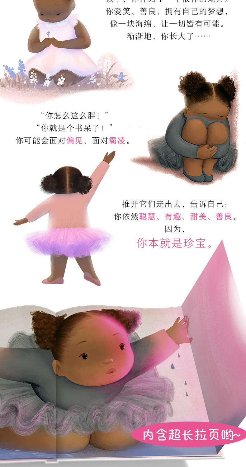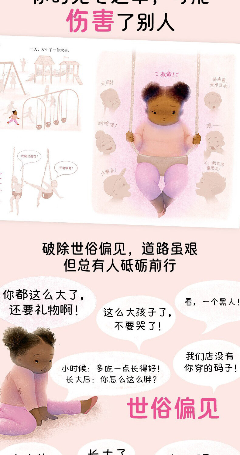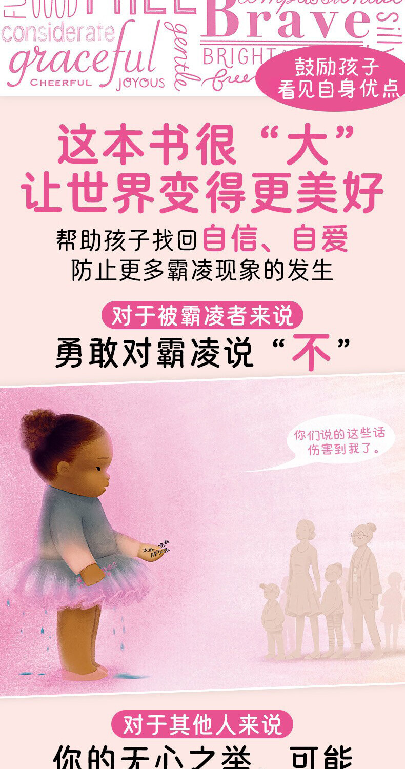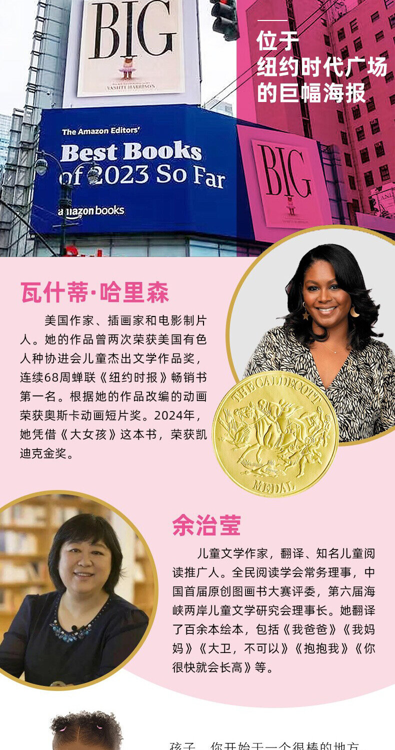 “我是个胖女孩,这有错吗?学校的芭蕾舞表演要开始了,别的女孩子可以演粉色的雏菊和玫瑰,老师却让我演一座乌云大山。当我卡在秋千上,没有人来帮我,有的只是嘲笑:‘你看她,简直像一头鲸鱼一样!’这些话就好像刻在我身上一样,怎么也抹不掉。” 很多女孩都有这样的经历:她们因为胖、矮、有颗痣被嘲笑,也可能是因为性格内向,甚至是成绩好,而承受着语言和行为上的暴力攻击。而这些偏见和霸凌给孩子带来的影响,很可能是一辈子的,她们不再自信、勇敢,不再是那个勇敢做自己的女孩了。 2024年凯迪克金奖图书《大女孩》是国内第一本关注胖女孩的反霸凌绘本。这本书为一些还在迷茫的胖女孩,也是未来的“大女孩”指路。体形并不是错,与众不同也不是,错的是那些偏见和霸凌的话语和行为。 《大女孩》值得每个养女儿的家庭拥有,它让每个女孩懂得爱自己,发现原来自己这么美,拥有一颗“大心脏”,成长为一个“大女孩”。