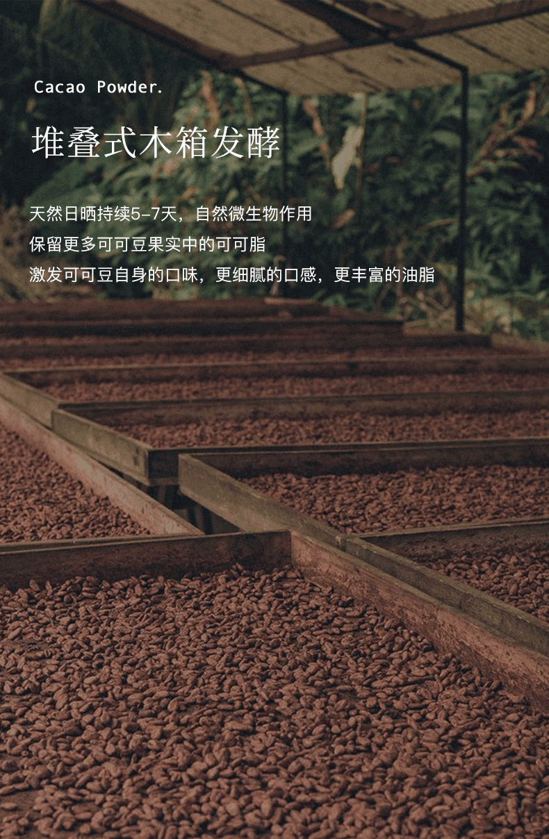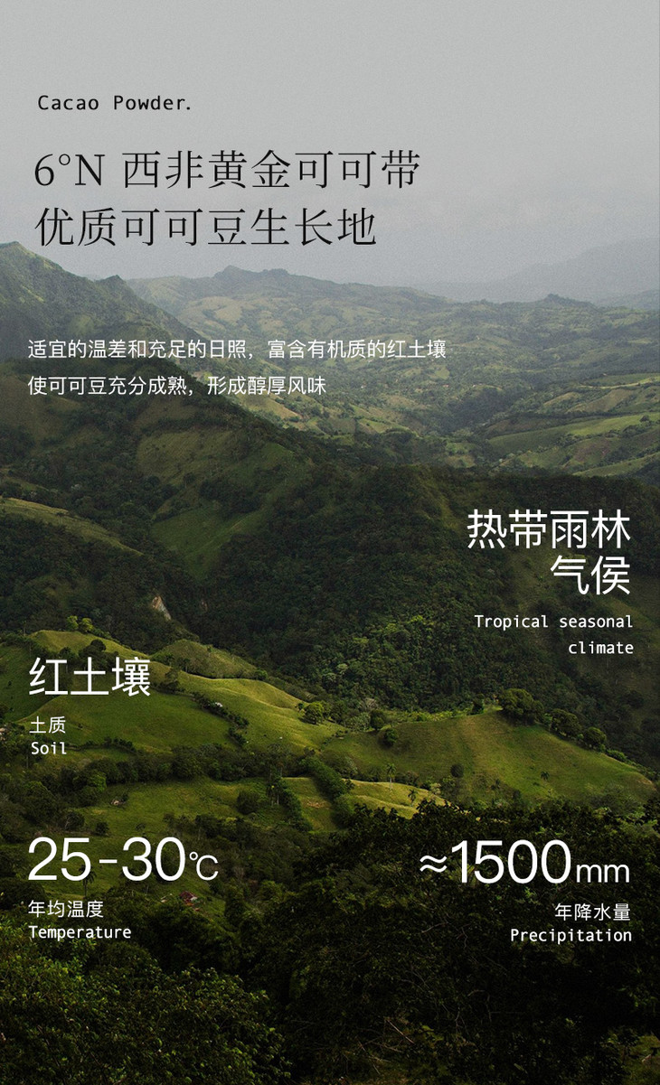 可可粉,选用福拉斯特罗可可豆。风味强劲,榛果黑巧与布朗尼的浓厚丝滑香气沁人心脾。既有热带水果的甜美,又有花香的清新,还夹杂着坚果的醇厚。经5年时间淬炼,终发育成为可可豆荚,并于此时采收。一棵可可树的生产寿命约为25年,这就意味着每棵树至多结5次果,每一次都更弥足珍贵。