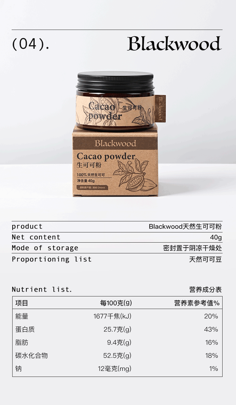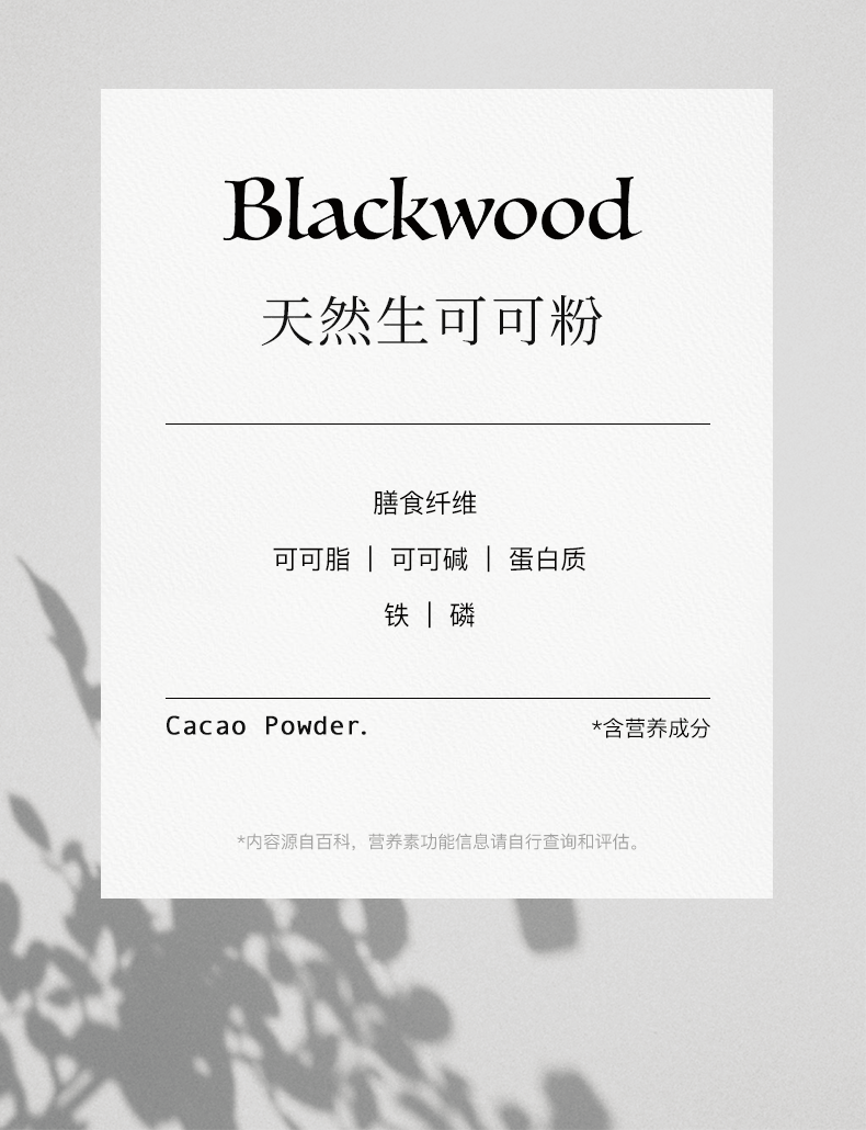 Blackwood生可可粉未碱化未经高温烘焙和加工,因此营养成分更高,简简单单一杯,可以饱腹超级久。早起一杯,保持心情愉悦一整天。