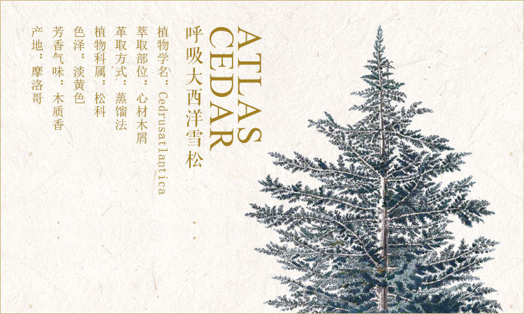 大西洋雪松 有“松树维生素”之称的大西洋雪松精油,是【般若】助眠后调的完美加法,气息持久稳定而具有建设性力量,让你进入更深的呼吸 ,并藉此提高机体细胞活性和免疫力。在【般若】里加入大西洋雪松,除了上述理由,更多因为 “呼吸”。萃取自二十年以上老树心材木屑的大西洋雪松精油,拥有著名的“丸子三兄弟”——倍半萜酮、倍半萜烯、倍半萜醇三种芳香分子,通过呼吸进入人体,可以清洁血液和防止黏膜发炎,杀死存于呼吸道中有可能导致感染的各种微生物,并藉此提高机体细胞活性和免疫力。