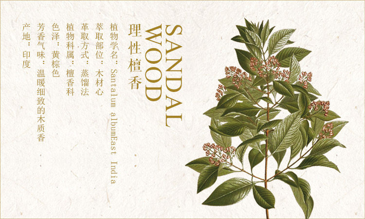 东印度檀香檀香中稀有的檀香醇芳香分子直接作用于脑下垂体,它能温和平衡神经系统,却无任何副作用。