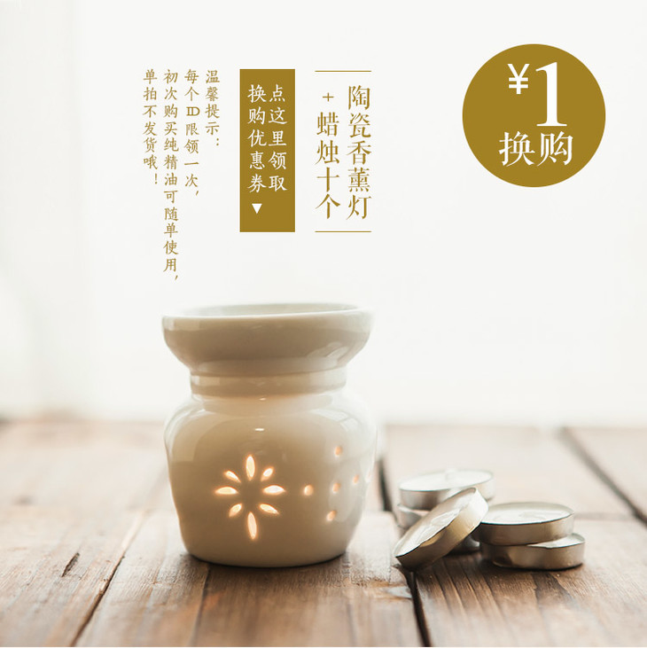贴心小礼物,给您更好的助眠体验:初次购买枕草子复方助眠纯精油,可1元换购陶瓷香薰灯和蜡烛。即使是初次接触精油的用户,也可以马上体验扩香助眠了。