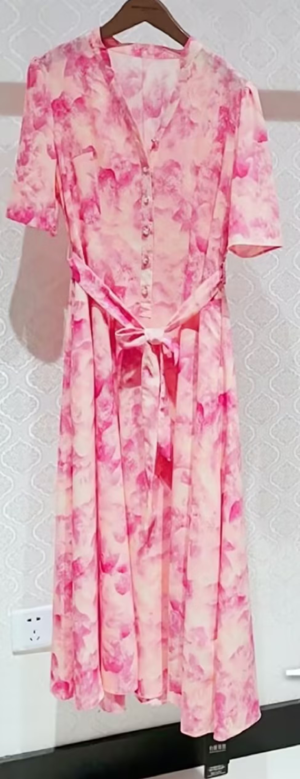 HJ1S66_水红色_V领连衣裙_夏季_设计感开襟短袖晕染花卉印花收腰系带显瘦_高级女装_BERNIEELEN 伯妮斯茵