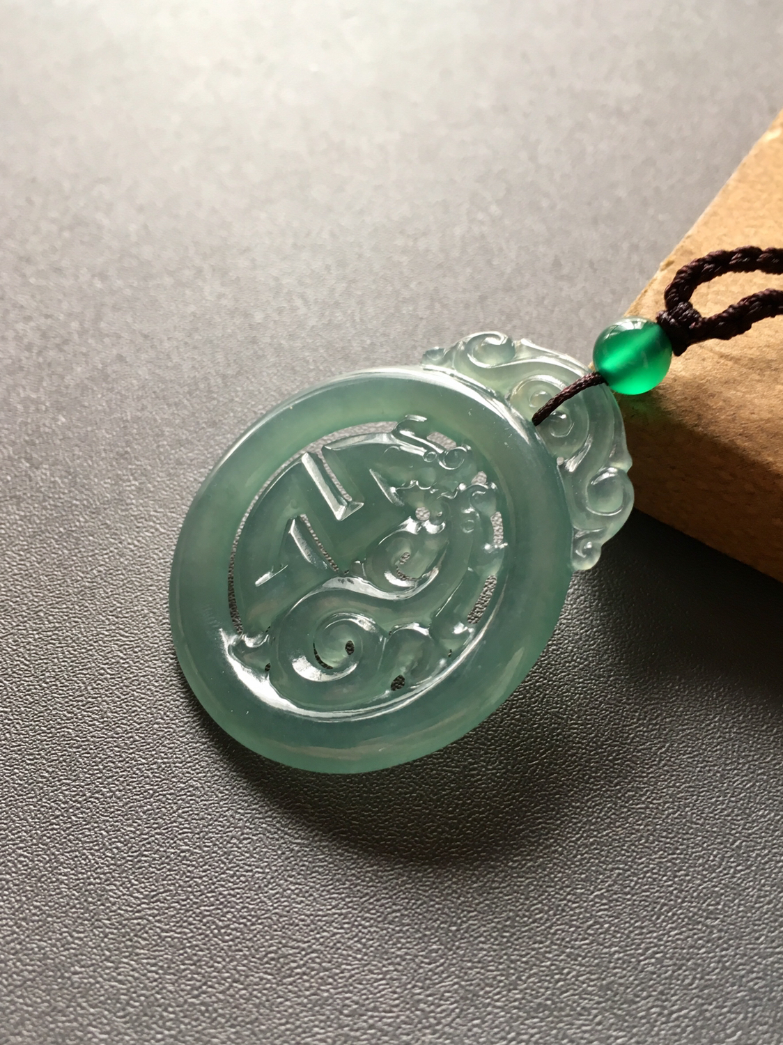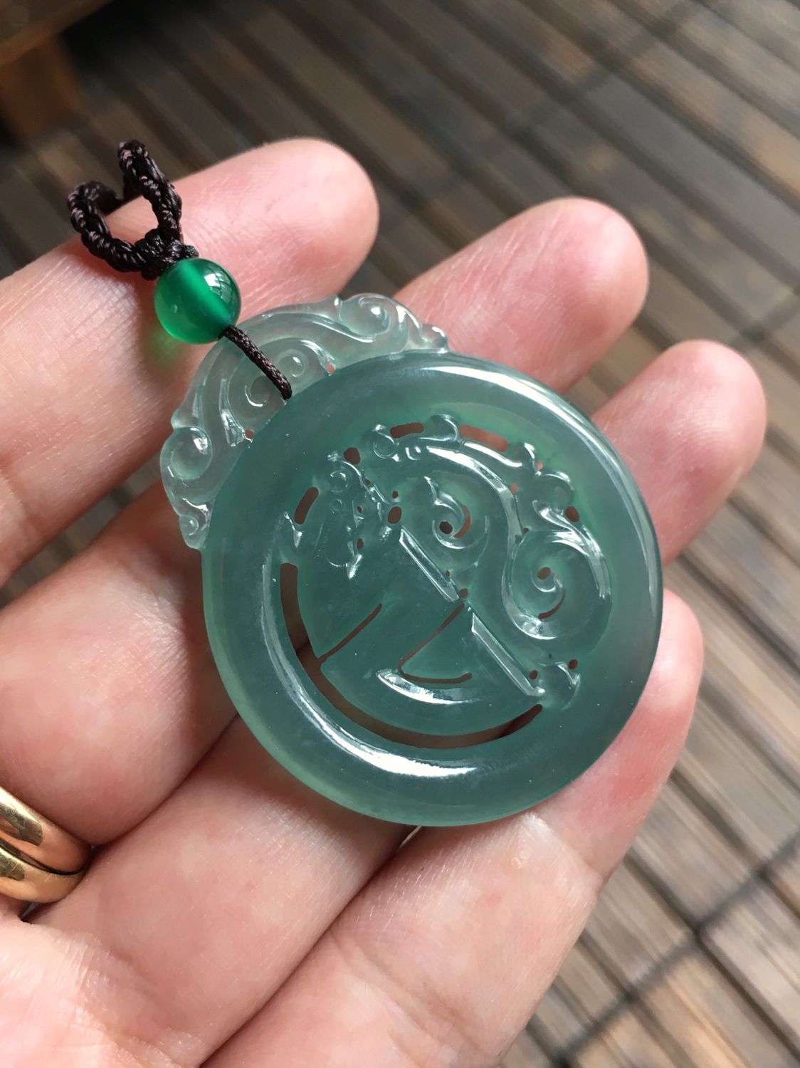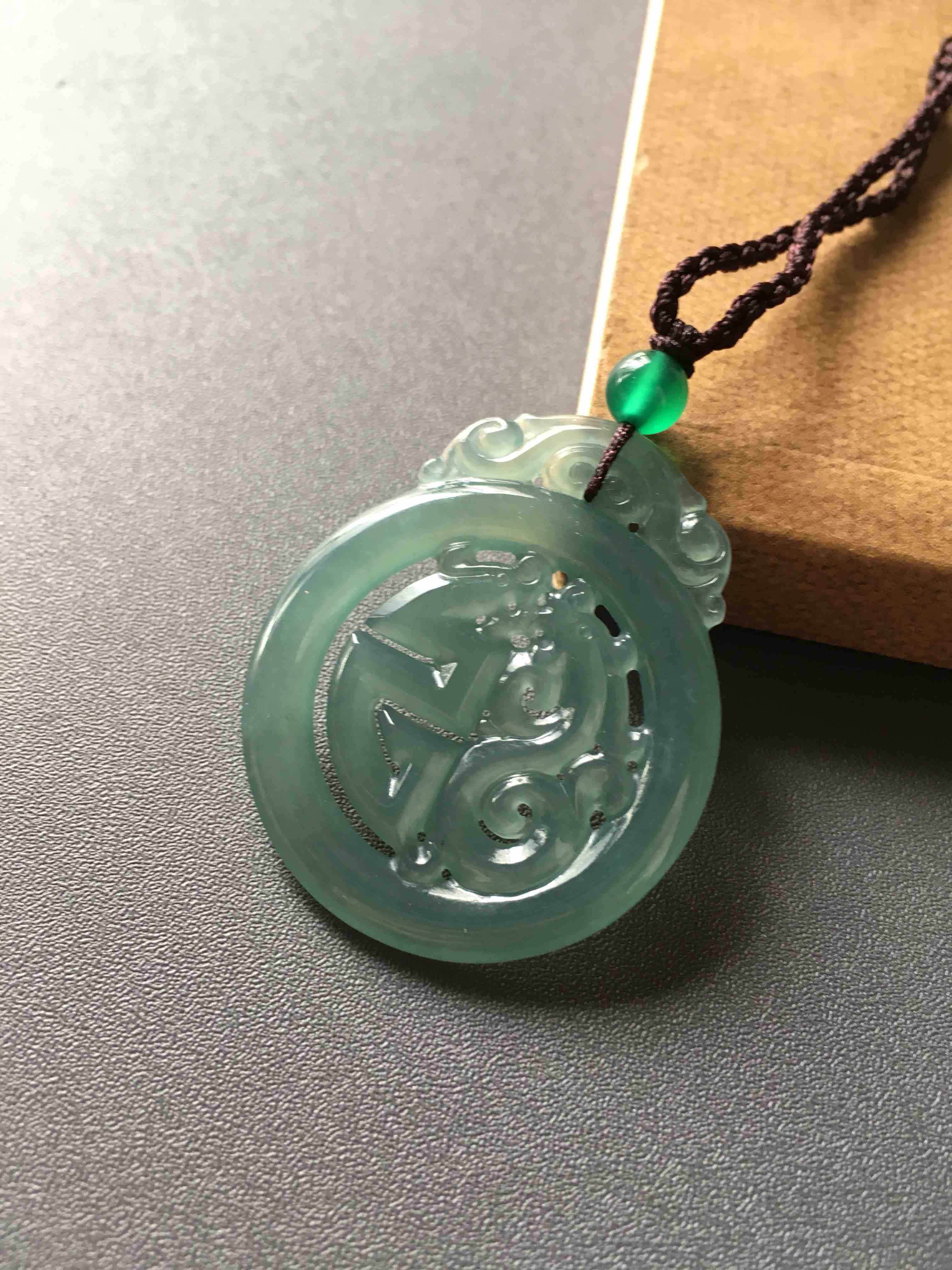 冰种蓝水翡翠龙凤,42.2×35.4×3.5mm,尺寸大气,雕工精美,古典气质,种水晶莹剔透,蓝色深邃,物美价廉,喜欢蓝水的朋友千万别错过机会啦