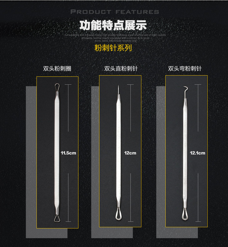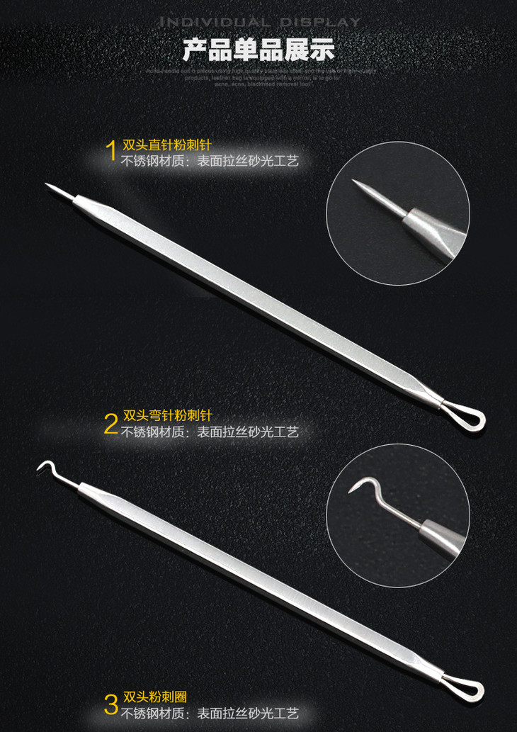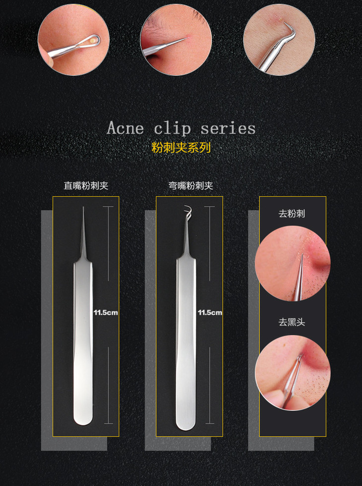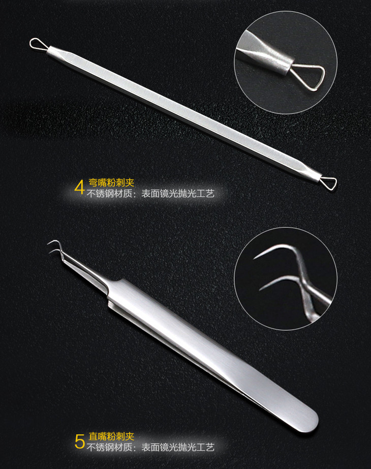 套装规格:双头粉刺圈(长)+双头粉刺圈+双头直粉刺针+双头弯粉刺针+直嘴粉刺夹+弯嘴粉刺夹 +高清镜,加送10片消毒酒精棉布