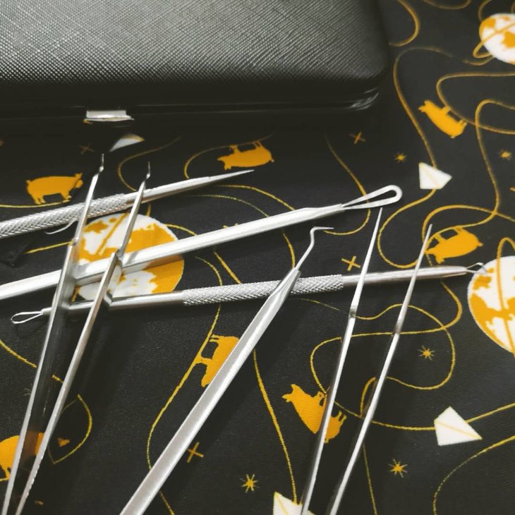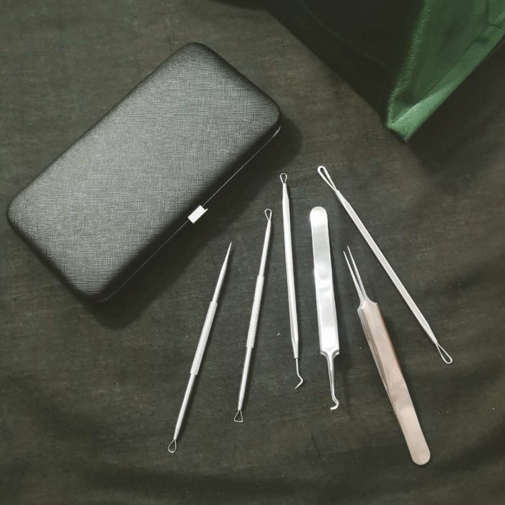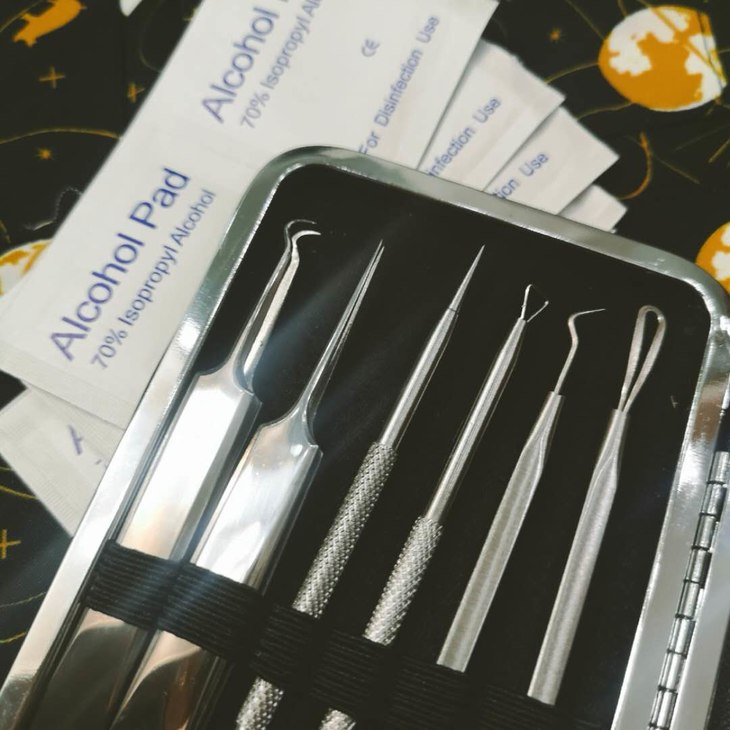 我上的这套清痘暗疮针是包括了粉刺圈、粉刺针、弯勾粉刺针,直嘴粉刺夹和弯嘴粉刺夹,基本上是可以满足大痘小痘、黑头粉刺的问题了。具体每个小工具的使用方法,我下面有详细介绍,你们仔细看!因为这个真的很难用语言来描述。我还额外给你们配了用来消毒的酒精棉布,送了十片!用工具之前先消消毒,用完也消消毒!