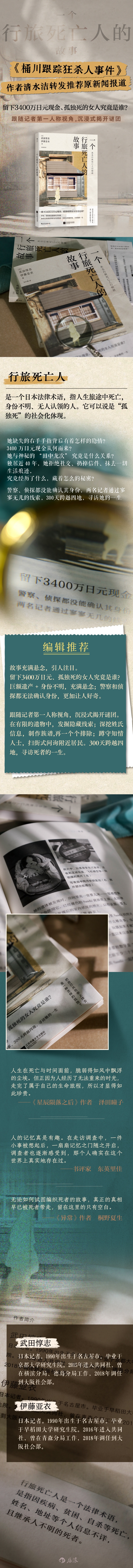 ▣ 行旅死亡人,是一个日本法律术语,指人生旅途中死亡,身份不明、无人认领的人。它可以说是“孤独死”的社会化体现。从本书中可以窥见日本对于“孤独死”的处理规定和流程。