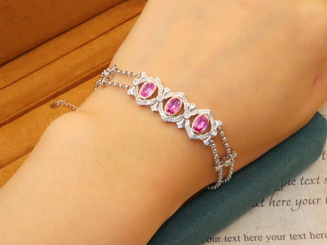 523159 无烧帕帕拉恰蓝宝石手链 石重:1.63ct,总重:7.02g,钻石:0.312ct/90颗 18K白金,真金真钻石 超值价:7480