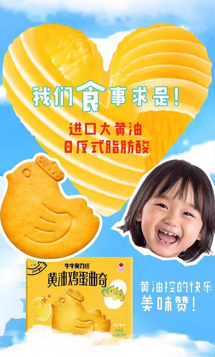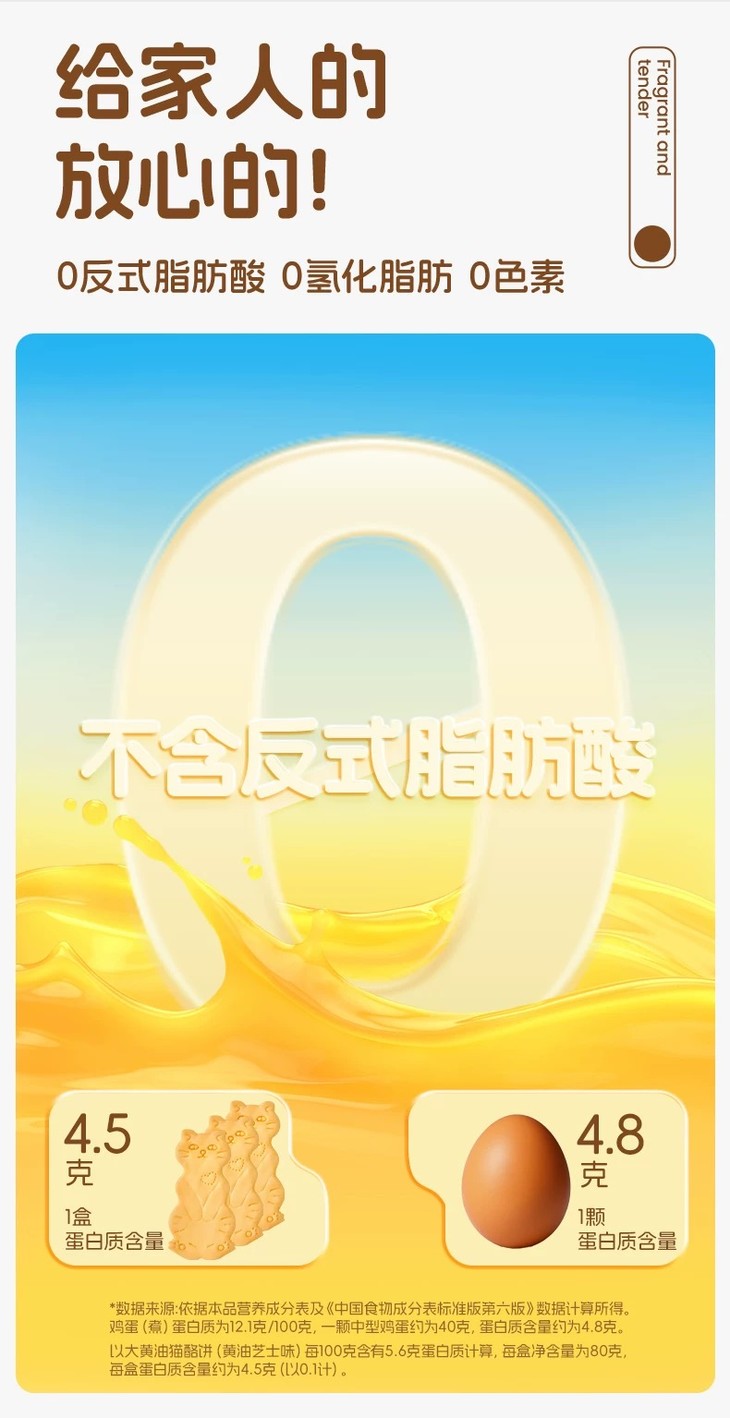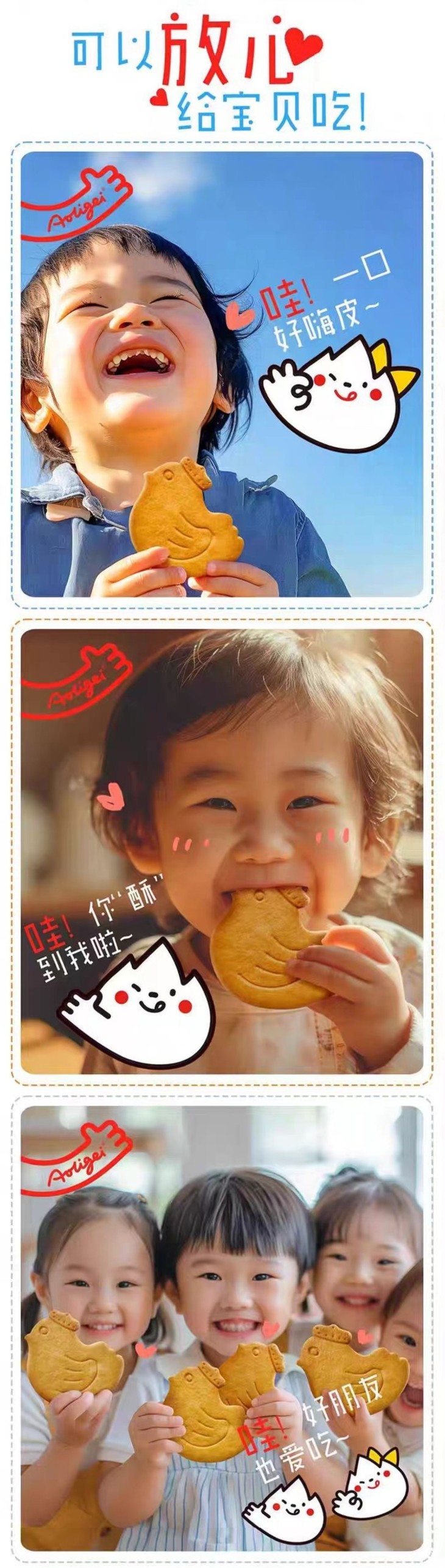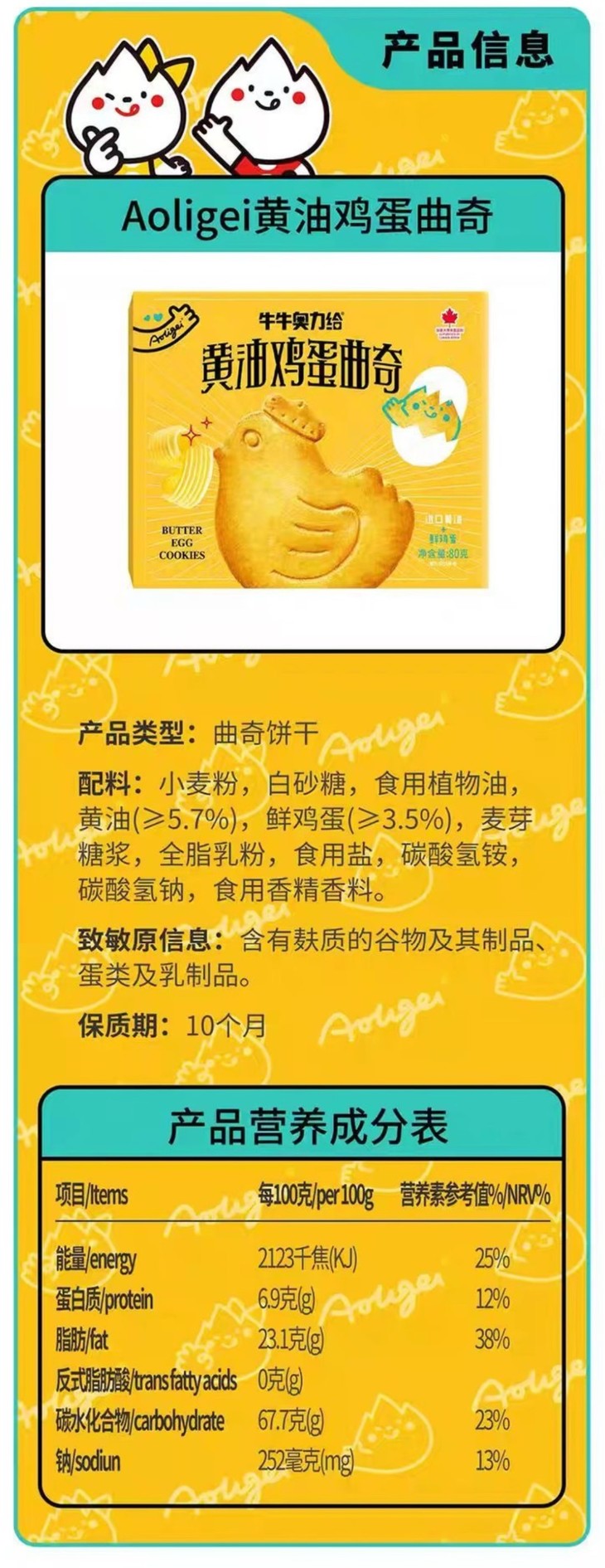 再看酥软王者黄油鸡蛋曲奇,Q版小鸡造型可爱到犯规,而且很大只哦,小朋友见了直接挪不开眼!一拆开包装,新鲜农家土鸡蛋液混合进口黄油的浓郁香气就扑面而来,入口满是奶香与蛋香交织,口感松软不腻、簌簌掉渣,黄油控直接原地封神!同样0反式脂肪酸,配料扎实无多余添加,好吃又放心。