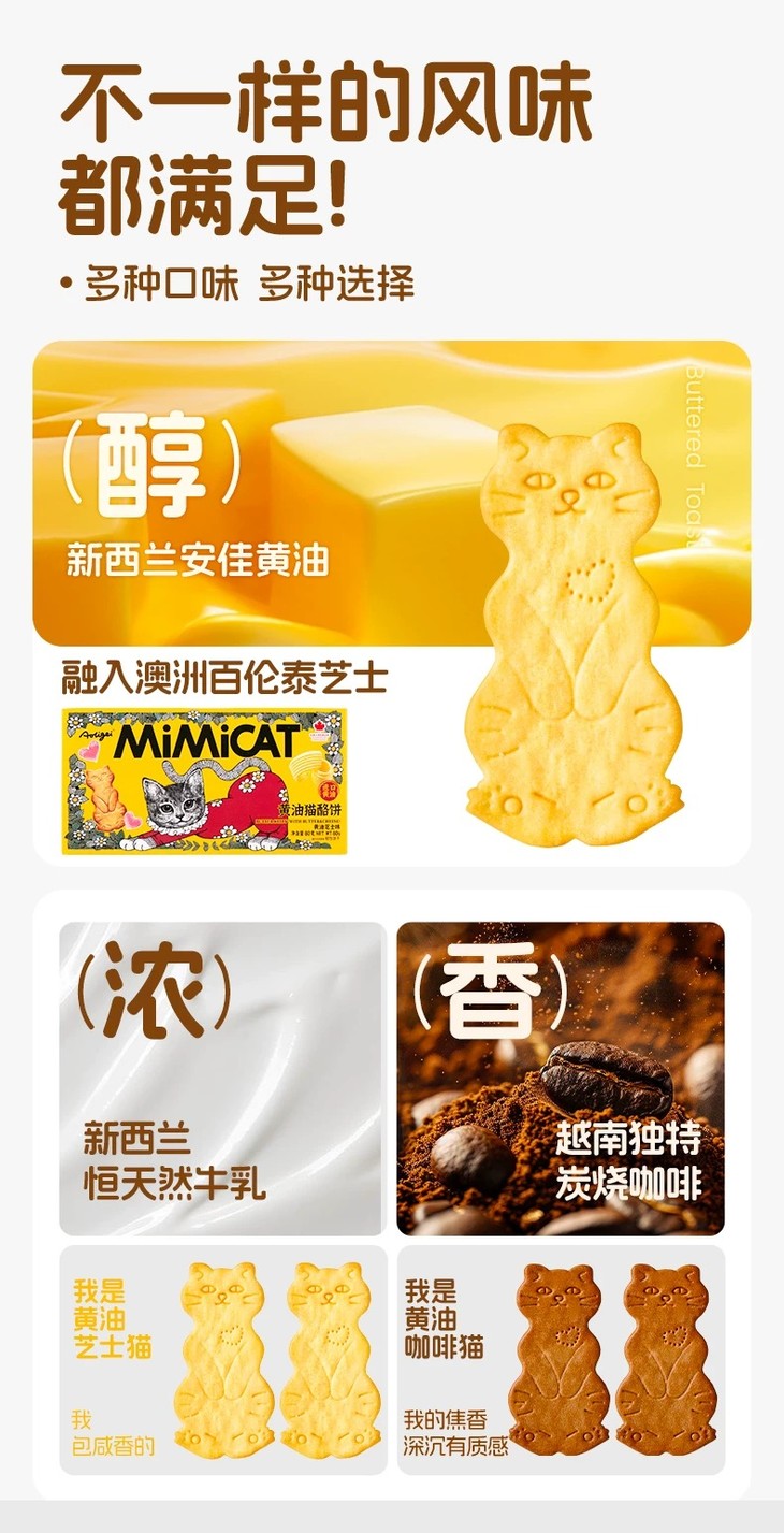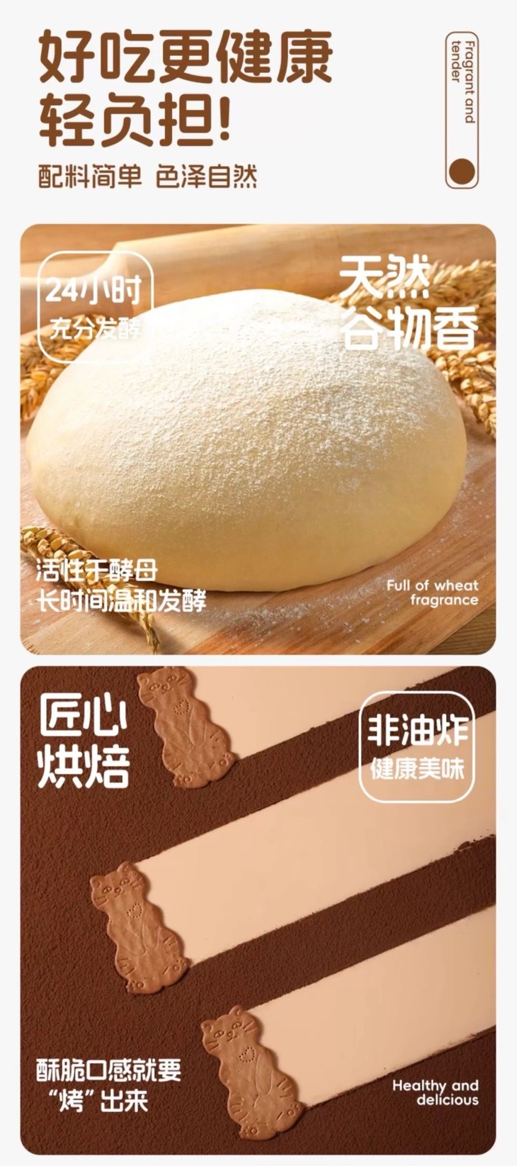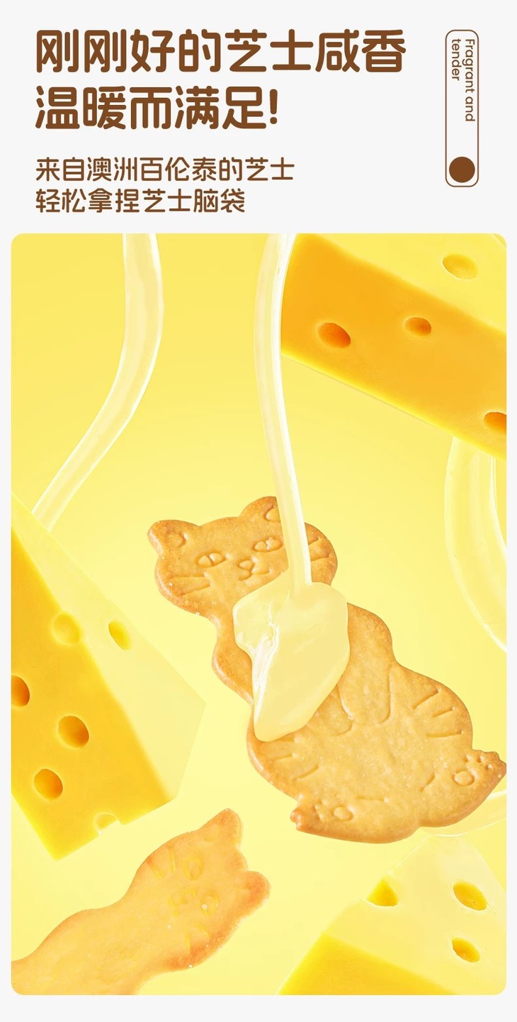 作为萌系代表的黄油猫酪饼,口味藏满惊喜!精选新西兰安佳黄油、恒天然牛乳搭配澳洲百伦泰芝士,经过24小时充分发酵+烘烤,非油炸更健康,还遵循欧盟标准生产、全程无菌操作,出口品质有保障,每一口都是优质食材的纯粹香气!更让人安心的是,它无反式脂肪酸、无氢化脂肪、无色素,配料简单,大小朋友都可以放心吃!