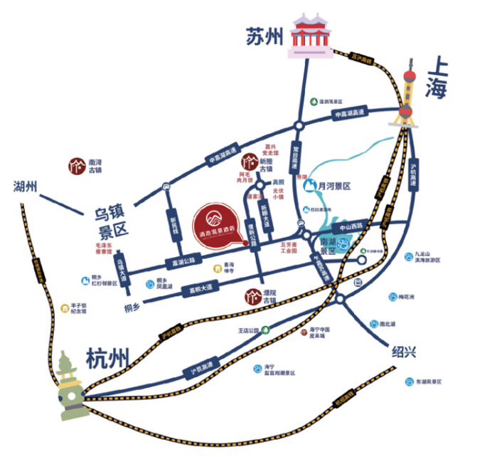 西接乌镇、东瞰南湖,被乌镇、濮院、新塍三大古镇所环绕。不仅拥有30余个露天池汤,还有6400平室内立体温泉区,室内室外,大大小小,各种各样泡池只有想不到,没有泡不到的,清池温泉酒店是一个集汤池、康体、餐饮、娱乐为一体的度假胜地。
