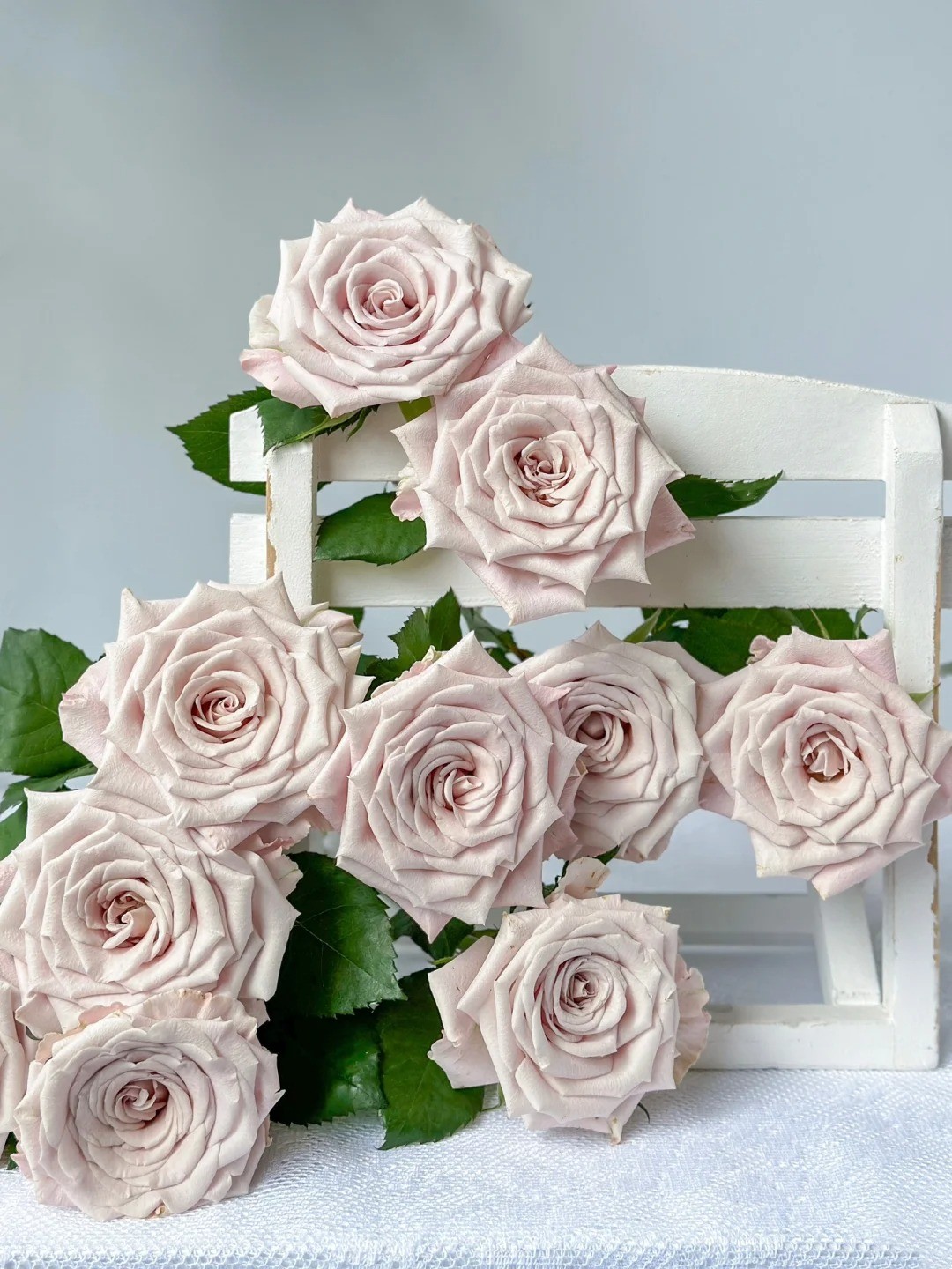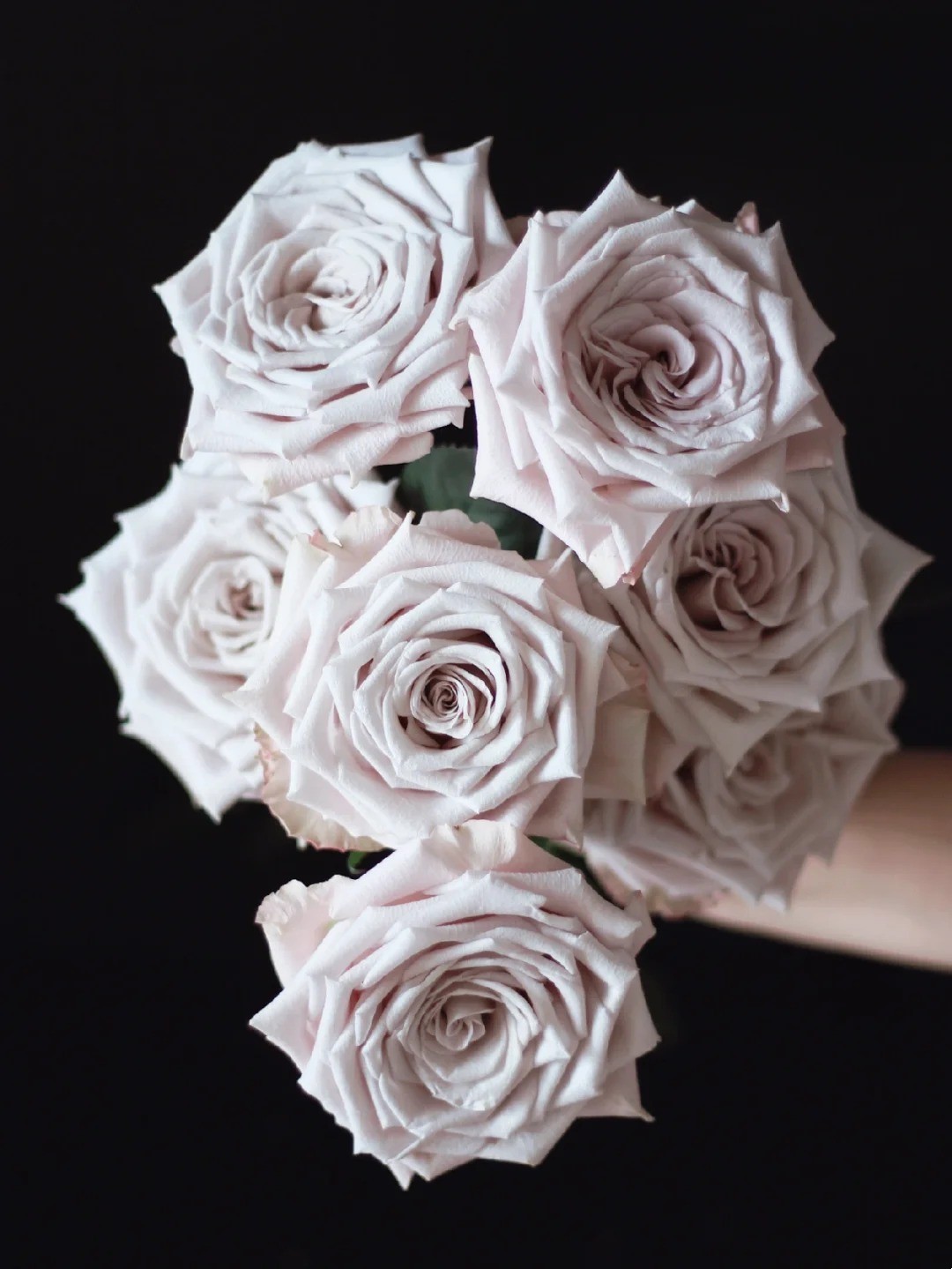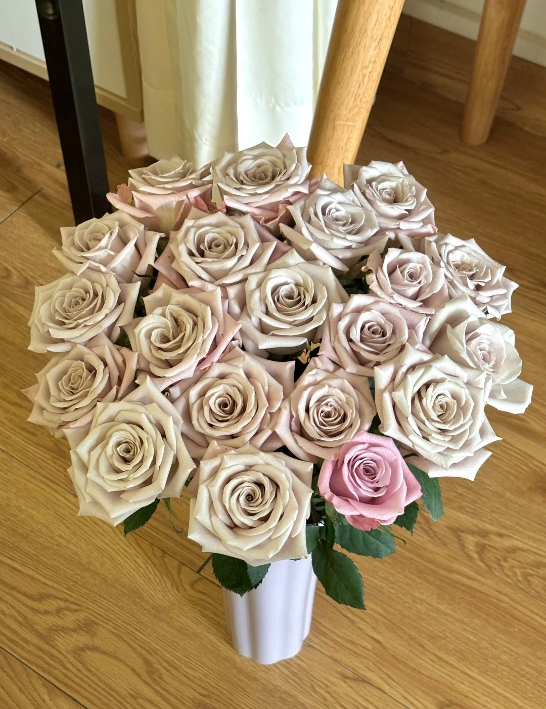 【花名】曼塔玫瑰 【花语】梦始之地,寓意着回到当初的追求、起点。【外观特点】花朵呈浅杯状,花瓣层数较多,花瓣较为圆润。花型大小适中,开放度通常在 8 9分左右。曼塔玫瑰花瓣颜色程灰紫色,不过受季节、土壤、气温影响较大,上色深浅程度不同。乌梅子酱玫瑰就是由曼塔玫瑰喷色而成。 【分类】蔷薇科蔷薇属 【养护技巧】 (醒花)深水醒花4-6小时 根据脱水情况来定 (水位)花瓶2/4左右。用凉开水或者纯净水+84一滴+营养液 养护会更好 (换水)夏天一水到底,水混浊可换,冬天4-5天一换 换的时候洗根剪根1-2厘米 (修剪)45度斜剪根部 【花期】7天左右