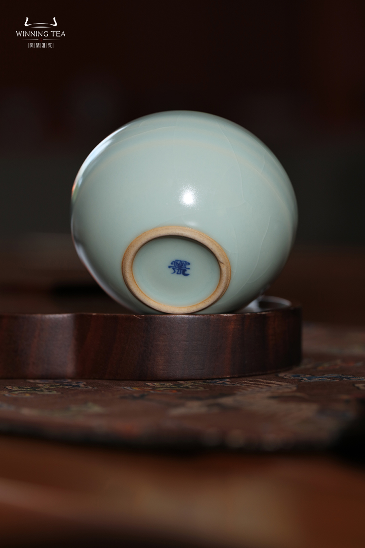 问鼎汝瓷鼎峰柴窑月白观月杯(梵红描金狮子绣球)