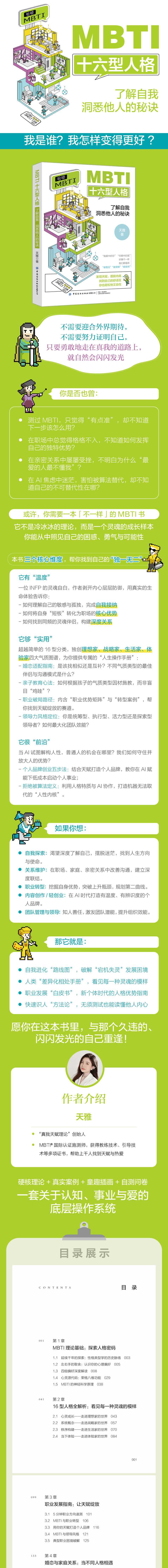 第1章 MBTI 理论基础:探索人格密码 00111 延续千年的探索:性格类型学的历史脉络 00312 左右手的取舍:认识你的心理偏好 00513 四组偏好深度解读 00814 心灵源代码:荣格八维功能 02915 MBTI 的神经科学原理 038第2章 16 型人格全解析:看见每一种灵魂的模样 04121 心灵成长走进理想家的世界 04322 系统概念走进战略家的世界 05723 秩序构建走进生活家的世界 07024 当下体验走进体验家的世界 084第3章 职业发展指南:让天赋绽放 09931 5 分钟职业方向速测 10132 MBTI 与职业转型 10633 用你的天赋打造个人品牌 11634 MBTI 与领导风格 12135 典型职业困境破解 125第4章 婚恋与家庭关系:当不同人格相遇 13341 伴侣应该相似还是互补 13542 不同人格类型的婚恋观 14043 人格差异与冲突解决 14944 因材施教的教育方法 156第5章 自我进化之路:超越类型的局限 16151 为何我的 MBTI 类型总在变 16352 别让类型成为标签 16753 人格成长:从低阶到高阶 16954 劣势功能:压力状态下的潜能激活 174第6章 无须测试也可掌握的快速识人法 17761 单个字母判断法 18062 组合字母判断法 18463 整体风格判断法 187附 录 测测你的 MBTI 类型 193