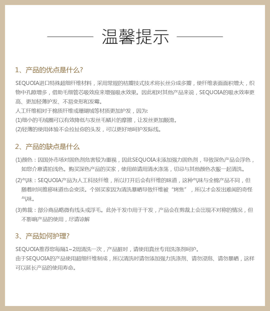 1、超强吸水??:采用高新技术,使100%DTY复合超细纤维,纤度只有普通纤维的二十分之一,相当于头发丝的二百分之一,吸湿速度是普通毛巾的七倍以上,迅速干爽湿发。