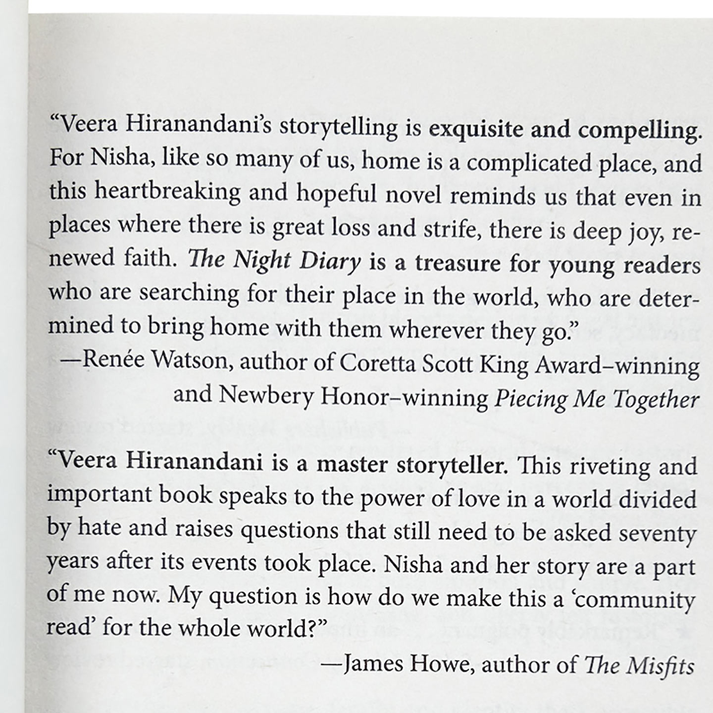 “一夜之间,尼莎的温暖庇护所突然消失。现在,印度教徒必须生活在印度,穆斯林必须生活在巴基斯坦。但尼莎既是印度教徒又是穆斯林,对她来说,哪里才安全呢?虽然美国儿童不太熟悉这个故事的历史背景,但作者的讲述方式是容易理解的,同时也是有趣的、真实的。”——纽伯瑞银奖得主金伯利·布鲁贝克·布拉德利