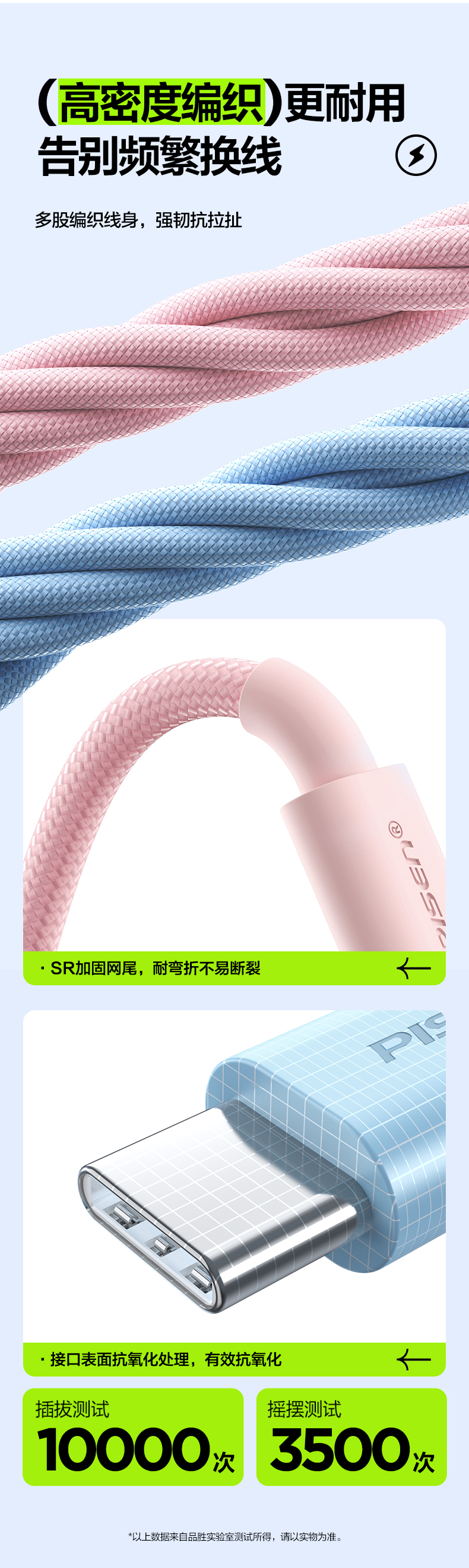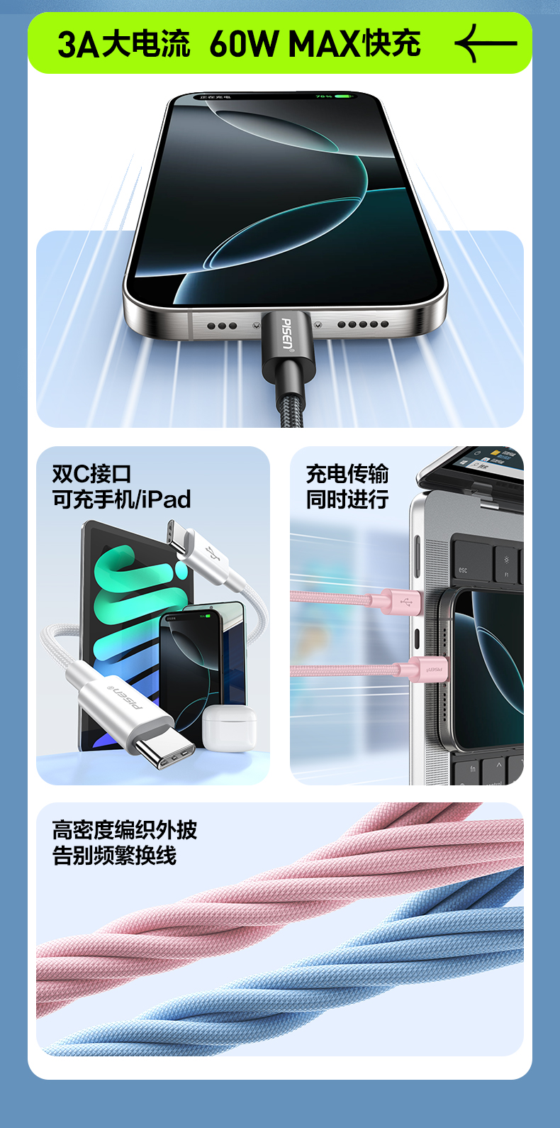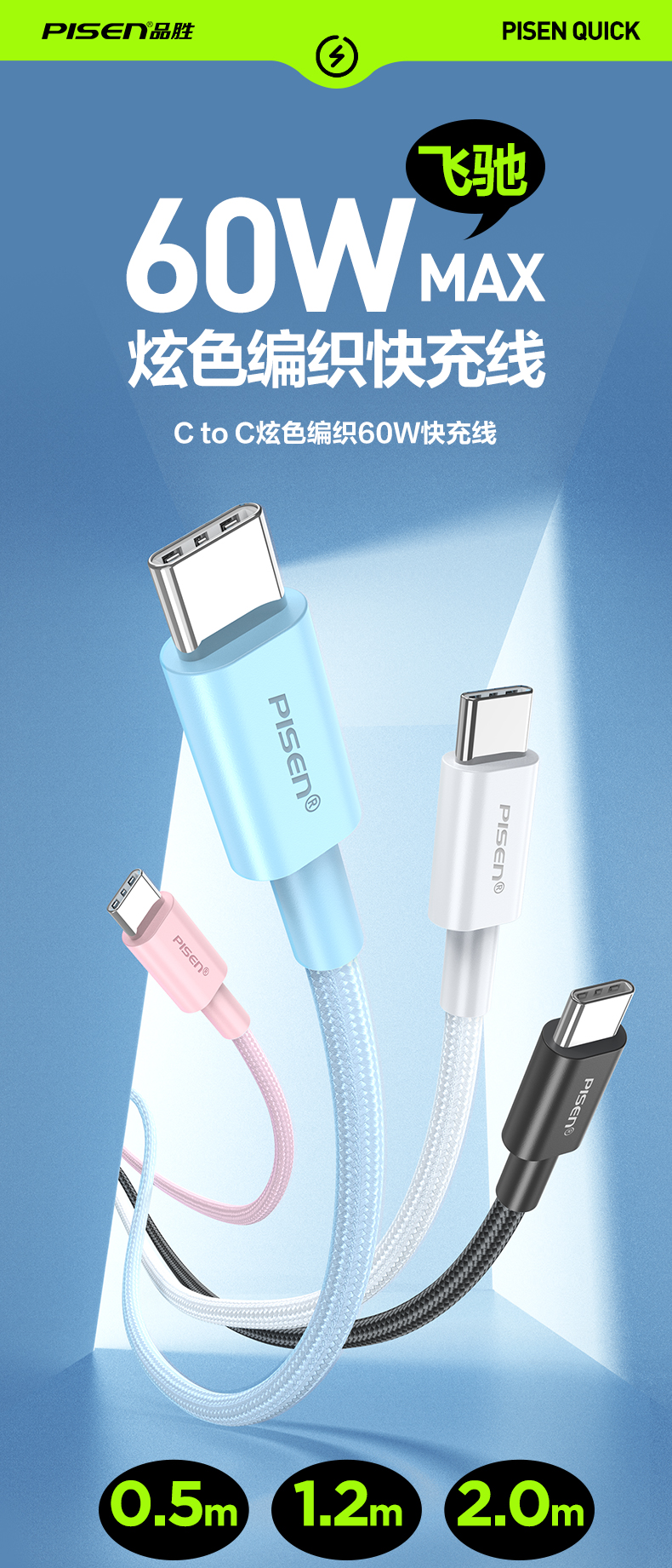 品胜 C to C炫色编织60W快充线1.2米 支持苹果15快充