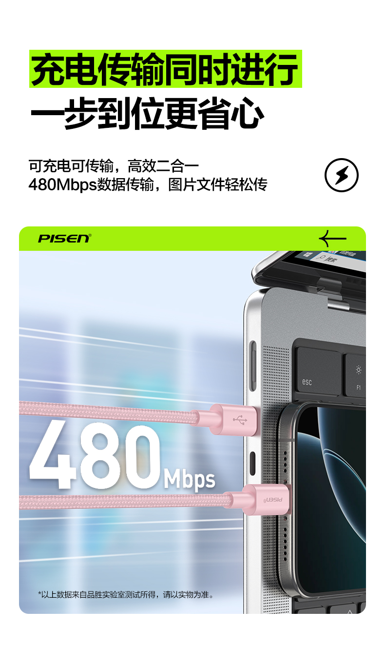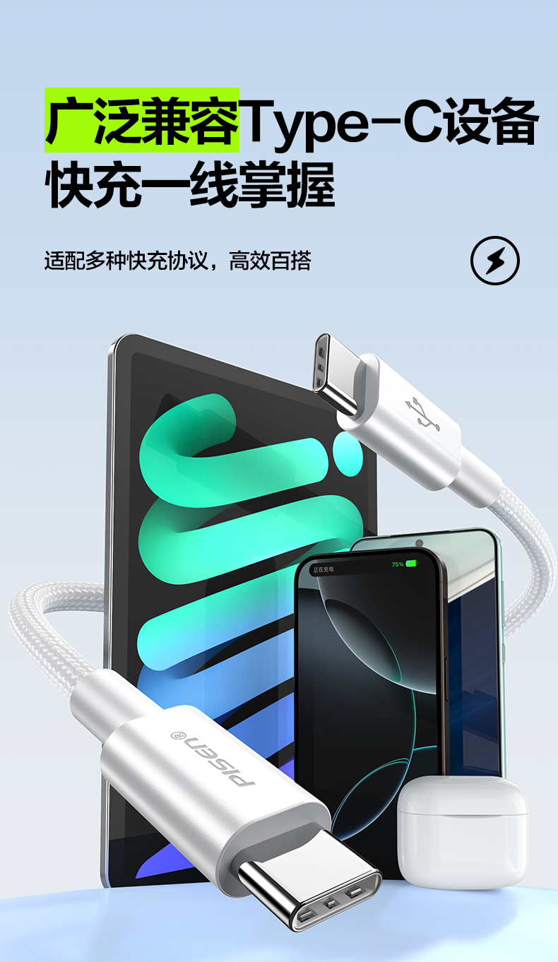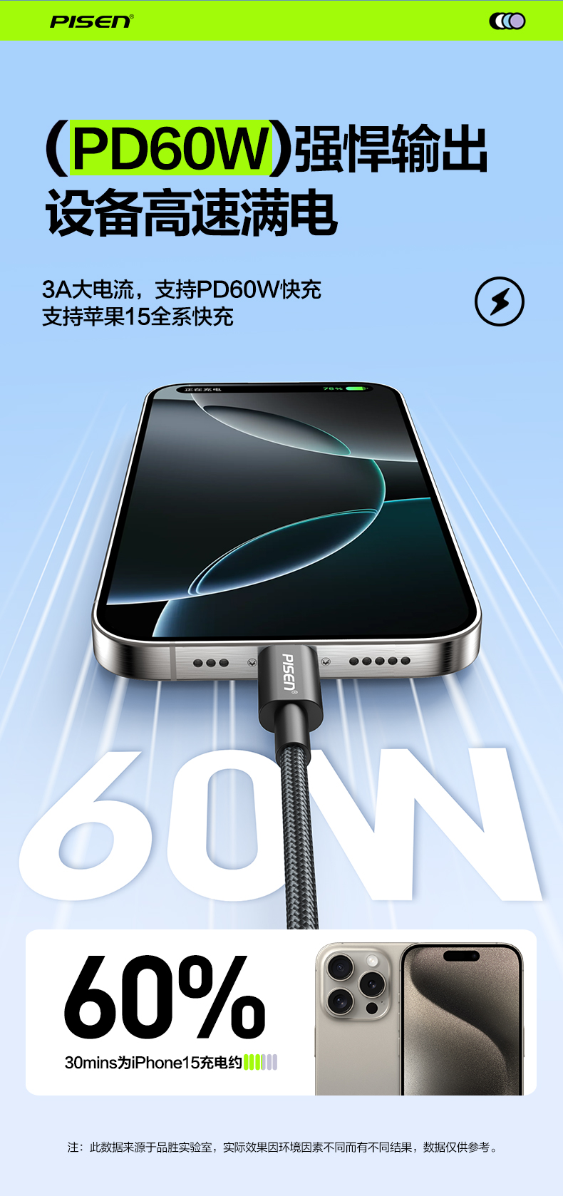 品胜 C to C炫色编织60W快充线1.2米 支持苹果15快充